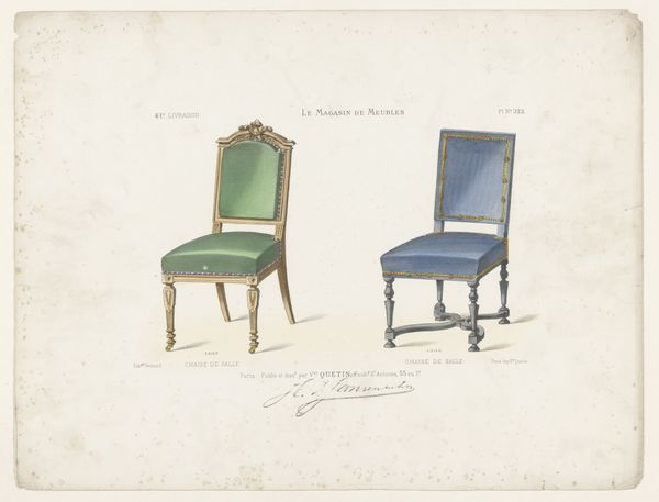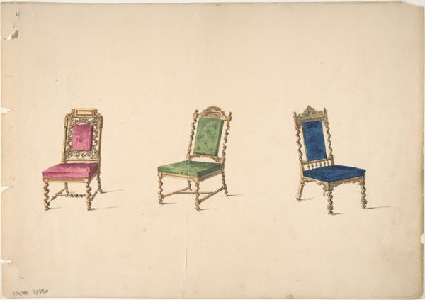 These watercolor chair designs, by an anonymous hand, showcase a fascination with symbolic form. Notice how each chair's ornate frame overflows with leaf motifs; these vegetal symbols, since antiquity, have represented growth, life, and prosperity. Consider the recurrence of the acanthus leaf, a popular ornament in classical architecture, here reinterpreted in gilded wood. From the capitals of Corinthian columns to these delicate chair backs, the acanthus speaks of enduring power and cultural continuity. The designer subconsciously taps into this collective memory, associating the sitter with dignity, importance, and perhaps a hint of divine favor. As we trace the journey of this motif, we see it resurface in countless forms, each echoing, and transforming the last, in a constant dance of visual inheritance.