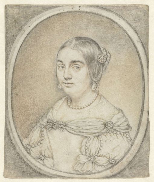 David Bailly created this portrait of Aertge Witsen in 1625 using pen and ink. The oval composition focuses attention on the intricate details of Witsen’s lace collar and patterned dress, rendered with precise lines and delicate shading. This formal approach evokes a sense of controlled elegance and quiet introspection. Bailly's technique is rooted in the traditions of Dutch portraiture. The use of line and form reflects a concern with capturing the likeness and social standing of the sitter. The artist skillfully uses the circular format to frame Witsen's face, guiding the viewer's eye and creating a sense of intimacy within the structured composition. The drawing's meticulous detail invites us to consider how representation functions as a cultural signifier. Bailly’s emphasis on detail transcends mere likeness, offering insight into the values and aesthetics of the time.