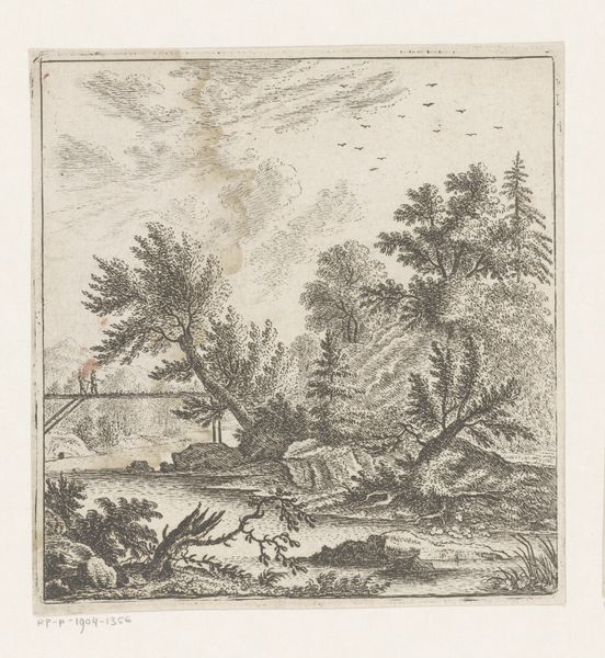 Johann Caspar Ulinger created this print, "Man met een hond wandelend langs een bosrand", using etching, a process dependent on the corrosive action of acid on metal. The dense hatching of lines, a testament to the engraver’s careful labor, builds up the image. This technique allows for a range of tones, from the lightest sky to the dark undergrowth, providing a sense of depth and atmosphere to the landscape. Look closely, and you’ll notice how Ulinger varies the spacing and direction of these lines to describe form and texture. The social significance of this work lies in its depiction of nature as a leisurely pursuit. The man and his dog suggest an elite class who have the privilege of enjoying the countryside. Consider the time and skill involved in creating this print, a sharp contrast to the relative ease of modern mechanical reproduction. Ultimately, this work reminds us that every image carries with it the weight of the materials, the making, and the social context from which it emerged.