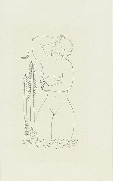 Editor: Here we have Tinus van Doorn's 1939 pencil drawing, "Badende vrouw," or "Bathing Woman" currently held in the Rijksmuseum collection. It strikes me as ethereal and almost childlike in its simplicity. What do you see in this piece? Curator: It whispers to me of hidden realms. There's an innocence here, but also something deeply knowing in her eyes, or where her eyes *would* be if they were actually drawn in, isn't there? Do you see how lightly the artist has suggested her form? A delicate dance of lines, almost a ghost of a woman, emerging, perhaps, from memory or dream? Editor: I hadn't thought of it that way, but yes, a bit dreamlike. And what about the bird and fish, or the minimal foliage? They feel almost like symbolic figures rather than mere objects in the scene. Curator: Precisely! Think of them as totems, perhaps representing freedom (the bird) and the subconscious (the fish). And those trees? Could they be guarding something? Van Doorn’s world isn’t simply observed, but *felt*, don’t you think? It is a little window into his inner landscape. Editor: So it's less about a literal bathing woman and more about… something else? Maybe a journey, or a feeling? Curator: Oh, absolutely. The literal is just the diving board. It's about that elusive sense of self, a dance between what is seen and what is imagined, caught in a single, elegant gesture. Editor: It's amazing how much can be conveyed with so few lines. I’ll never look at a simple drawing the same way. Curator: And that’s the magic, isn’t it? Finding worlds within the simplest of forms, sparking a connection beyond the immediately visible!
