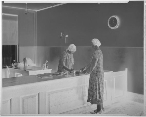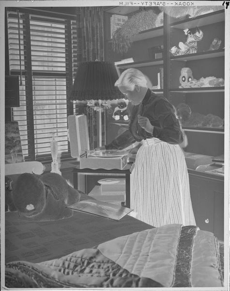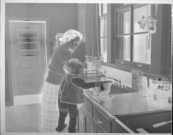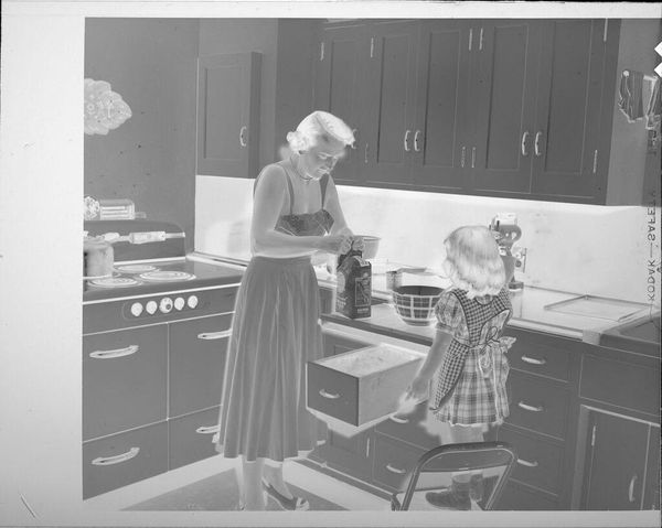 Curator: This intriguing, small-scale, untitled photograph by John Deusing depicts a woman baking a pie in her kitchen. I’m immediately struck by the domesticity of the scene; it seems incredibly ordinary. Editor: Ordinary perhaps, but also deeply constructed. Consider the labor involved—the ingredients, the tools, the oven itself. This isn’t just about baking; it's about the means of production within the domestic sphere. Curator: Absolutely. And the photograph, as an object, participates in that construction. The image, now housed in the Harvard Art Museums, takes on a different valence when separated from its original context. How does its current setting affect our understanding? Editor: Exactly! Think of the social context. This image, presented in a museum, elevates the everyday labor of women. The kitchen is no longer just a space for sustenance; it's a site of artistic and economic activity. Curator: The light is fascinating, too. It almost feels staged, drawing attention to the act of baking, emphasizing it as a performance. Editor: Right! And the pie itself becomes a symbol, both of nurture and of the often-unseen work that sustains daily life. We are asked to consider not only what is depicted, but the very act of its making and its material existence. Curator: An image of simplicity that holds such complex layers of meaning. Editor: Precisely. It makes us question where we draw the line between the practical and the artistic.