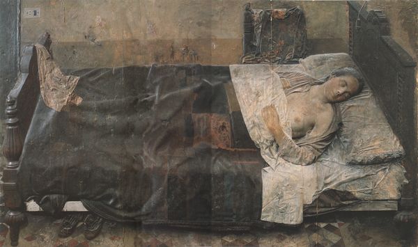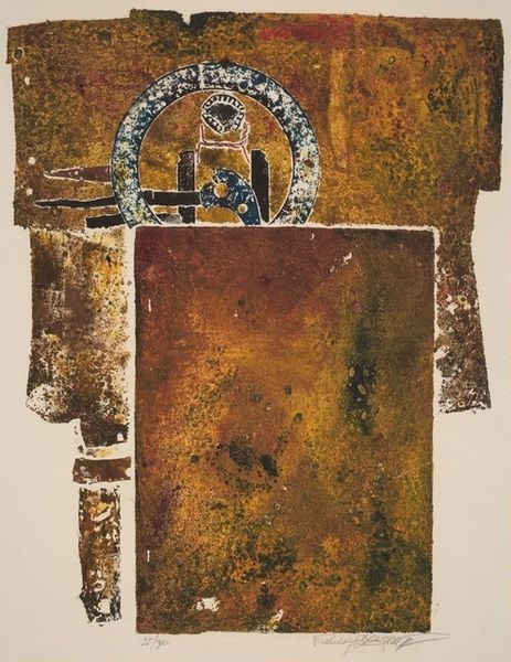 Editor: Harry Thubron’s "Caracol" is a mixed media piece of unconfirmed date at the Tate. I find the composition intriguing, like fragments of memory pieced together. What symbols do you see here? Curator: The horseshoe shape, gloves, and textual fragments evoke a past— perhaps industrial or agricultural. Consider the horseshoe: a symbol of luck, but here broken, incomplete. What does that fragmentation convey? Editor: Perhaps a sense of loss, or a questioning of traditional beliefs? Curator: Precisely. Thubron often worked with found objects, imbuing them with new meaning. These aren't just materials; they're cultural artifacts, carrying layers of history and association. What feelings does the stark palette evoke for you? Editor: The somber tones create a mood of melancholy and contemplation. I never thought of found objects being that deeply layered. Curator: Exactly. Thubron masterfully transforms discarded elements into poignant narratives.