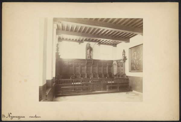 This photograph, Interieur van de kapel der Kruisheren te Uden, captures the chapel's interior with a muted palette, focusing on form and light. It's like a study in grayscale, where the tones create depth and a sense of quiet reverence. The surface has this soft, almost dreamlike quality, probably achieved through the photographic process of the time. You can sense the textures—the hard stone of the floor, the smooth wood of the pews, the intricate details of the altar. The way the light filters in, hitting the backs of the chairs, creates a rhythm that pulls you into the space. It feels like you could almost reach out and touch the cool stone of the floor. Thinking about the wider conversation of image making, it reminds me a little of some of Agnes Martin's subtle works, with their quiet contemplation and focus on simple forms. Both artists, in their own way, invite us to slow down and find beauty in the everyday. There's something so compelling about art that embraces ambiguity, leaving room for our own experiences and interpretations.