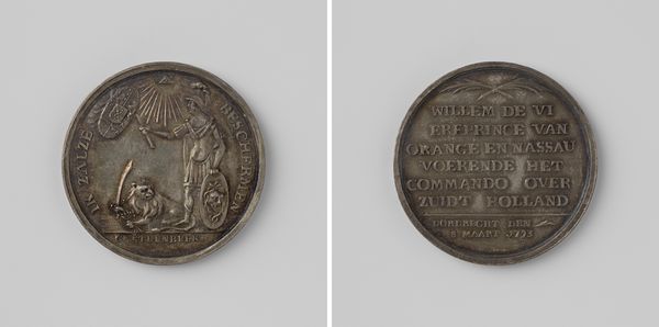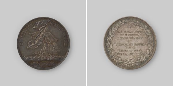 Editor: Here we have a metal sculpture from 1833 by M. Borrel entitled "Bezoek van Leopold I en Louisa Maria, koning en koningin der Belgen aan Parijs" or "Visit of Leopold I and Louisa Maria, King and Queen of the Belgians, to Paris." It appears to be a commemorative coin or medallion. I'm struck by how official and stately it feels, almost like propaganda. How do you interpret this work, considering the period in which it was created? Curator: It's interesting that you use the term propaganda. This medallion operates within a specific political and social context. Consider the early 19th century, a time of great upheaval and shifting national identities in Europe. These objects served to solidify power, legitimize rule, and broadcast an ideal image of monarchy, obscuring potentially uncomfortable realities for the working classes. It makes me think about who produced and consumed it. Were such objects made for wealthy, privileged elites who collected art or gave them as gifts, to show the Belgian royalty in a glorious light to visiting French aristocracy? Editor: That's a great point! I hadn't considered how it was intended to be circulated. It reinforces the idea of a harmonious relationship between the Belgian monarchy and the French, especially after the Belgian Revolution. The inscription celebrating their visit, framed by what looks like laurel leaves—symbols of victory and peace—feels carefully constructed. What could have been its significance within discussions of national identity and cultural exchange during that time? Curator: Absolutely. And beyond its intended symbolism, think about what the medallion omits. It focuses on idealized figures, but what about the working class or colonized populations whose lives were also impacted by Leopold I? Engaging with art history also demands critical engagement with power structures. Do you see something of modern day celebrity worship culture reflected in this? Editor: I definitely do. Seeing it through that lens really changes my perspective. I went from thinking about official visits and "high society", to something else, more insidious! Curator: Exactly! Hopefully we will both ask questions about visual representation in these broader terms moving forward.