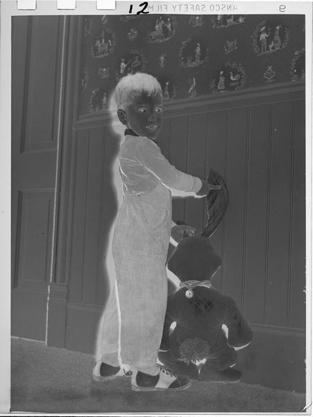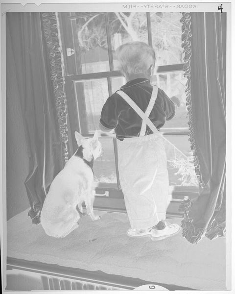 Editor: This photograph, "Untitled (boy next to window with dog)" by Lucian and Mary Brown, is quite small but evokes a sense of intimacy. What stands out is the texture – the curtains, the boy's clothing, even the dog's fur. What can you tell me about it? Curator: I see a study in the social context of domestic life. The visible "Kodak Safety Film" watermark points to the democratization of image-making through accessible materials and the rise of amateur photography. The medium itself becomes a commentary on the everyday. Editor: So, it's about the accessibility of the photographic process itself? Curator: Exactly. How it allows ordinary people to document their lives and surroundings, blurring the lines between artistic expression and a simple record of material existence. Editor: That really shifts my perspective on what the photograph is trying to capture. Thanks!
