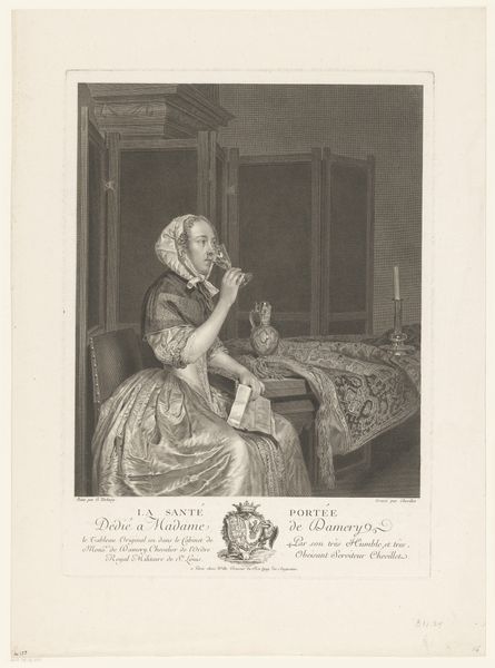 Nicolas Joseph Voyez created this print, "Interior with a young woman sitting on a chair, looking at two doves on a desk," using engraving, a method with a long history linking design to production. Engraving involved using a tool called a burin to carve lines directly into a metal plate, traditionally copper. The depth and spacing of these lines determined the amount of ink held, and thus the darkness of the printed image. This painstaking process demanded skill and precision, reflecting a significant investment of labor. Before photography, prints like this played a crucial role in circulating images and ideas, acting as a visual internet for their time. The social context of this print is interesting. It allowed for a wide distribution of the image, thereby democratizing access to art. Yet the very scene it depicts—an interior with fine furniture—suggests a lifestyle of leisure, supported by the labor of others. The contrast between the print's mode of production and its subject matter invites us to consider the complex relationship between art, labor, and social class in the 18th century.