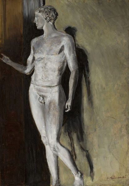 Editor: Here we have Richard Gerstl's "Self-Portrait with Palette (Nude in a full figure)" from 1908, rendered in oil paint. It's such a striking and somewhat unsettling image, with the rawness of the brushstrokes and the artist's direct gaze. How do you interpret this work, especially in relation to the art world at the time? Curator: What strikes me is the almost defiant presentation of self. Consider Vienna at the turn of the century – a place of incredible artistic ferment but also stifling social constraints. The Expressionist movement, to which Gerstl is closely tied, served to act as a response to these conditions, where the role of art to depict psychological and cultural forces took center stage. By depicting himself nude, palette in hand, he's challenging the conventions of portraiture but also making a statement about the artist's role and the public perception of what it means to produce Art. Do you see that rebellion here, or perhaps something more introspective? Editor: I do see that rebellion, but also a vulnerability. Was there something specifically in the cultural or political landscape that made such a raw self-representation so provocative? Curator: Absolutely. Think about the rise of psychoanalysis with Freud in Vienna; this fueled an intense interest in the inner self, in psychological truths that were often suppressed. The fact that he’s challenging conventional morality, especially within a highly bourgeois society, adds another layer. Gerstl, in a way, embodies this tension, pushing boundaries and exploring new artistic territories. It becomes, for me, not just a personal portrait but a broader statement on art's role in societal upheaval. Editor: So, his work reflected and fueled the changes happening around him. Curator: Exactly. And it reminds us that art is not made in a vacuum but is deeply intertwined with the social and political currents of its time. I never thought about Gerstl in that way! Editor: This has definitely made me consider it on a completely different level. Thanks!