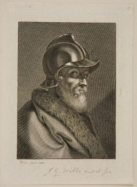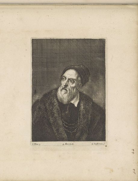 Curator: This is Jacopo Bernardi's engraving of "Tiziano Vecellio," residing here at the Harvard Art Museums. What strikes you first about it? Editor: The weight of the portrait, literally and figuratively. The subject's heaviness seems to carry the weight of tradition, of societal expectation, of patriarchal authority. Curator: Yes, there is a certain stoicism in his gaze. Bernardi, working in the 19th century, captures something timeless in the Renaissance master, Tiziano. The texture of the fur, the glint of the chain... Editor: Which begs the question, who gets memorialized in art, and why? This portrait feels like a sanctification of elite masculinity. Whose stories are we not seeing? Curator: Art is powerful; it shapes our perspectives of the world, both past and present. Editor: Exactly. We must always remember to look deeper.