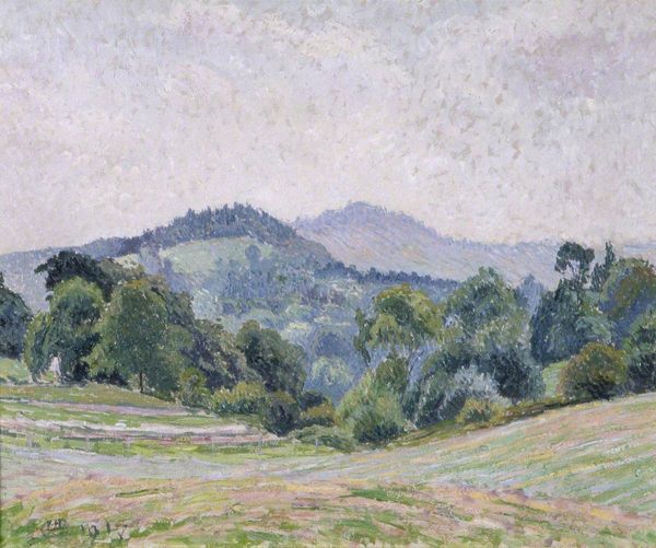 Curator: Looking at "The Distant Town," painted in 1910 by Rose O'Neill, I'm struck by how she blends plein-air techniques with elements of impressionism and even expressionism, using oil paint to capture this sprawling cityscape from afar. What’s your immediate response to this vista? Editor: Oh, wow, it feels so… dreamlike, almost as if this whole scene is a fading memory. That buttery sky blending into the hazy horizon – I can practically taste the melancholic air of a late summer afternoon. There's something really magical in its softness. Curator: I find it fascinating that O'Neill, best known for creating the popular comic strip character "Kewpie," also dedicated time to painting landscapes like this. It speaks volumes about the diversity within early 20th-century artistic expression and how artists often defied simple categorization, also what that did in terms of creating accessibility, for example. Editor: Exactly! It totally dismantles that idea that you can only be one kind of artist. Seeing her playful spirit peek through here, even amidst all the seriousness of academic art, makes the whole painting that much more relatable and endearing, doesn’t it? Though maybe I'm seeing too much of Kewpie in that swirl of the clouds… Curator: Perhaps! But looking closer at her brushwork, the way she renders light across the fields, reveals an artist deeply engaged with capturing fleeting moments. "The Distant Town," with its atmospheric perspective and focus on the interplay of light and color, resonates with the rise of impressionist ideals and plein air aesthetic values and what that has to say about modernity as an idea. Editor: It definitely pulls you in; that almost flattened perspective adds this incredible sense of vastness. It's as though we’re invited to share in the artist’s observation point on the hill—you can almost feel the breeze. Almost makes you wonder, what's *really* happening down there in the town? Curator: Considering O'Neill's engagement with social issues during her time, from women's suffrage to poverty, you almost get a glimpse of those undercurrents in her portrayal of this industrial-era urban center with all those emerging landscapes during the era. She wasn't afraid to use her art as a platform. Editor: I can definitely see that. Knowing that it makes the dreamy detachment of the scene even more compelling. Almost like she is acknowledging it without diving right into it. The work invites contemplation. What do you think? Curator: Yes, indeed. Her boldness shines through, prompting a rethinking about O’Neill beyond "Kewpie." Editor: It definitely makes you want to search her paintings even more now.