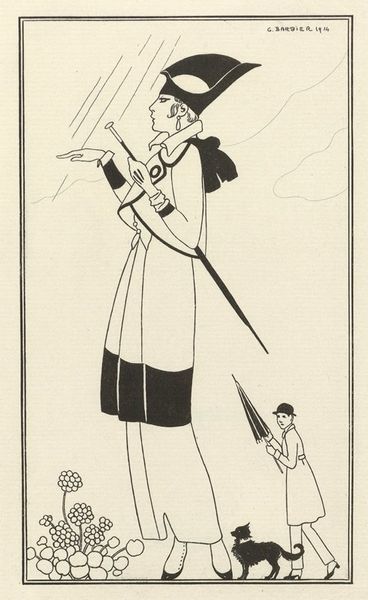 Curator: Oh, I do like the quiet confidence of this image. Shall we have a closer look? It's an illustration from the Gazette du Bon Ton, dated 1921. The print showcases a tailoring costume by Jeanne Lanvin and a race day dress by Beer. Editor: Immediately, what strikes me is this muted palette. The chalky reds against the toned paper, it feels both contemporary and somehow ancient. Curator: Indeed. The art deco influence is subtle yet apparent. What I find fascinating are the hats. Both seem like visual metaphors for status and perhaps even a kind of armor. Editor: I completely agree. Especially on the left, there is this rigid geometry—it's not merely about fashion; it's projecting a sense of controlled power, like, "Observe, but do not touch." Curator: And the figure on the right, seated, draped...she suggests a world-weariness that could be about anticipating an event—waiting for luck, waiting for opportunity. Her adornment implies privilege, sure, but it does not safeguard her. Editor: You're pulling out layers I didn't see initially. This balance of power and vulnerability...that little flounce of fabric here or the severe angle of that hat, such intentional, coded messaging. Curator: Precisely. And that tension, for me, is held beautifully in this duality – active and contemplative, exposed and hidden, tailored and adorned – it hints at the larger societal conversations that art deco always brings into frame. Editor: It's fascinating how something seemingly so of-the-moment like fashion, when viewed through this lens, becomes a historical and psychological document. So much contained in so few, deceptively simple lines. Curator: Ultimately, it's not simply about aesthetics, it’s about embedding a cultural dialogue into something we may at first casually label as ‘art’ or even ‘design’. That is why I enjoy such investigations. Editor: Yes! Absolutely…thank you. It is definitely more evocative than I first expected—off to contemplate some flounces now.