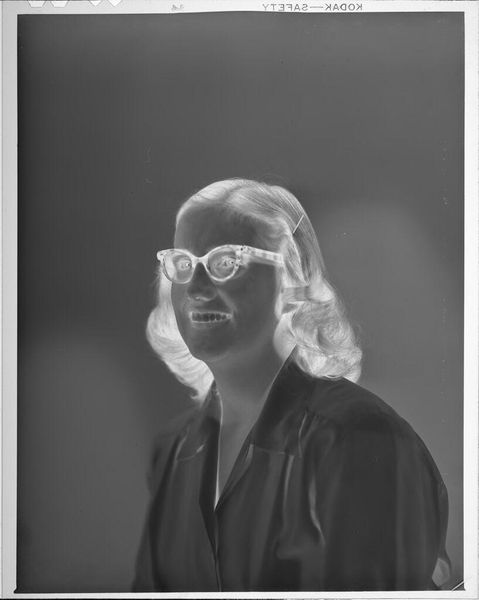 Curator: This arresting image, whose creators are Lucian and Mary Brown, is an untitled portrait of a girl in glasses, preserved at the Harvard Art Museums. Editor: It's strikingly spectral, almost like an x-ray—the inverted tones give it an eerie beauty. Curator: There's an element of seeing the unseen, yes. I find it powerful how such a seemingly straightforward portrait is rendered so unsettling. What does it reveal about the sitter, and about representation itself? Editor: Perhaps it speaks to the ways women were often framed in photographic portraiture—often as idealizations, rarely as subjects in their own right. The inversion seems to disrupt that. Curator: It's a ghost of an idea, then—a woman emerging from the very act of being looked at. It challenges how we perceive identity. Editor: Absolutely. I hadn't considered the implications of how light and shadow could be tools for reclaiming agency, even in a portrait.
