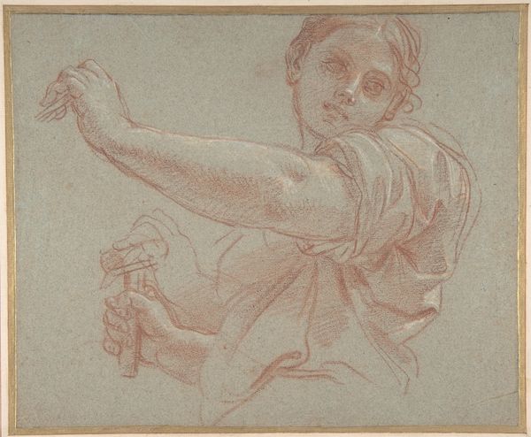 Editor: This is "Study for a Figure of Saint John the Baptist," a drawing by Lo Spagna. The lines are so delicate, yet the figure feels powerful. What do you see in the formal elements of this sketch? Curator: Notice the dynamic tension achieved through line and form. The arm, extended forcefully, creates a diagonal thrust that is countered by the delicate rendering of the face. Do you observe how the hatching defines the musculature and suggests volume? Editor: Yes, I see it now! It’s almost like the artist is using the lines to sculpt the form. I initially missed that. Curator: Precisely. The artist utilizes the medium to explore the interplay between light and shadow, ultimately achieving a heightened sense of realism and dramatic presence. What do you think of the negative space? Editor: I see how it adds to the drama of the figure. It makes me think about how every choice in art serves a function. Curator: Exactly. That's what formalism is all about.
