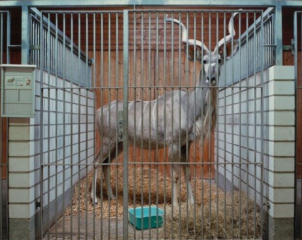 Curator: Volker Seding's photograph, titled "Patas Monkey, Bassett Wild Animal Farm, Cape Cod," believed to be captured between 1986 and 1988, presents a fascinating, if somewhat melancholic, scene. Editor: My immediate response is…disquiet. There’s something deeply unsettling about the composition, a monkey perched forlornly in what appears to be a rusted cage within a caged area, overlaid against a backdrop of institutional greenery. It speaks of layers of containment, wouldn't you agree? Curator: Absolutely. And it begs the question: What are we seeing? It’s vital to remember the historical context: small zoos and animal farms like Bassett were fairly common, but often operated with limited resources and, arguably, limited ethical considerations for the animals in their care. Editor: It certainly brings forth a dialogue on power structures. This image visualizes the captivity of non-human animals for human entertainment and, potentially, profit. Seding’s composition directs our gaze to the undeniable reality of control, but it doesn't appear that he's explicitly passing judgment, correct? Curator: I concur. The photo offers us a mirror reflecting a certain era. Seding’s photograph is more than a portrait of a monkey; it's a snapshot of our evolving awareness of animal welfare. He doesn’t use flashy artifice. Editor: Indeed. This raw visual document really resonates. It almost compels us to analyze our assumptions about dominion and interrogate systems that enable such sights. As an image, it holds significant potential for galvanizing discussions about environmentalism and conservation, urging viewers to think about the impact we wield. Curator: Precisely. It functions as an archive, recording a chapter in human-animal relations that necessitates perpetual questioning. Its impact will likely continue to expand in the cultural imagination. Editor: Ultimately, I believe this image serves as a visual indictment of anthropocentric worldviews. It is so incredibly important. Curator: And a necessary contribution to our critical consciousness about our shared world. Thank you.