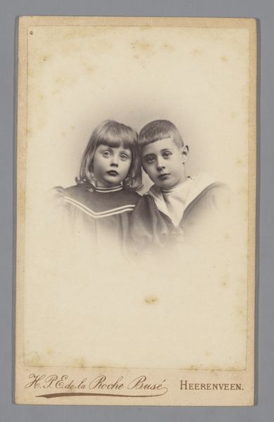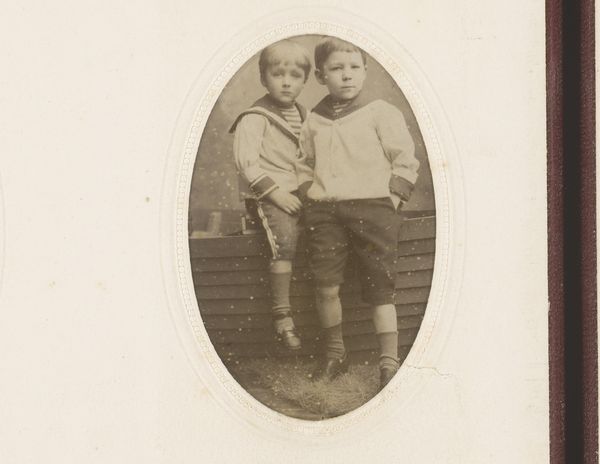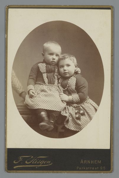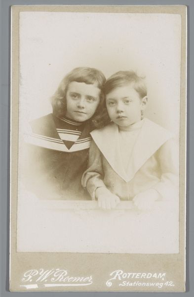 Curator: Jacques Chits, presumably a photographer working out of Haarlem and Amsterdam, made this portrait of two unknown boys. It's a gelatin silver print, likely taken sometime between 1882 and 1894. Editor: It's strangely unsettling. There's a directness to their gaze, an almost unnerving stillness, amplified by the tight framing. It feels weighty, considering how small the subjects are. And so pale! Curator: I would note the strategic employment of light and shadow; observe how Chits models their faces and clothes, delineating form and texture. There's a certain balance achieved by the placement of the two figures, and it gives order to the photograph. Note, too, the way the boys are positioned: one slightly in front, suggesting a hierarchy. Editor: Hierarchy or practicality? Making a gelatin print was a labor-intensive procedure, fraught with variables from emulsion to development. Posing children who likely weren’t still for long must have been part of that struggle. The very act of creating this photograph, the choices the photographer makes, feels palpable. Curator: Certainly, the photographic process is integral. However, analyzing the composition reveals more than the process involved: the delicate gradation of tone creates depth. It accentuates the details—the fine hair, the soft skin, capturing a fragile beauty. Editor: Fragile, indeed. Gelatin silver prints were commercially produced for mass consumption, cheaper to make, widely accessible… The lives these children lived beyond this captured moment – what conditions did they know, what clothes did they wear on a normal day? Knowing that informs everything! This object, in the context of its making, reflects not just beauty, but also the lives of those whose likenesses it carries. Curator: Perhaps. But it is through close attention to the elements of design—the lines, tones, forms—that we glean the deepest understanding of the artistic intention within this image, independent of speculative background details. Editor: Ultimately, for me, it’s about that ghostly surface, both index and echo of lost processes and fleeting existences. Curator: And for me, it’s about the elegant rendering of form and light, captured through the careful structuring of a moment.
