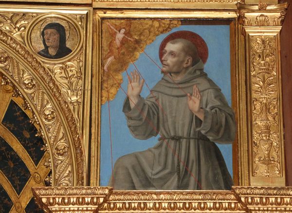 This is Stefan Lochner's depiction of the Stigmatisation of St. Francis. In this scene, St. Francis kneels, receiving the stigmata—the wounds of Christ—beamed down from a seraph. The motif of divine light transmitting grace is ancient. We see its echoes in depictions of the Annunciation, where rays of light connect the divine and earthly realms. Here, however, these are no mere rays, but instruments of corporeal transformation and a powerful expression of empathetic suffering. The seraph, a winged being holding the cross, recalls classical depictions of victory. The cross itself, an instrument of torture, has been transformed into a symbol of triumph and divine grace. Francis's raised hands mimic the posture of prayer and supplication that one finds in early Christian art and continue to see throughout the ages, connecting him with the past, present, and future devotees. This image is not just a depiction of a historical event, but an invitation to experience, subconsciously, the profound depths of faith and the mysteries of spiritual transformation. It's a stark reminder of how potent symbols endure, resurfacing across centuries, forever resonating with our collective memory.