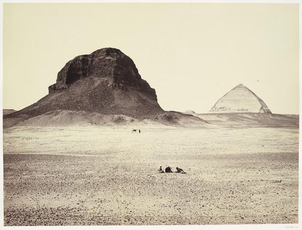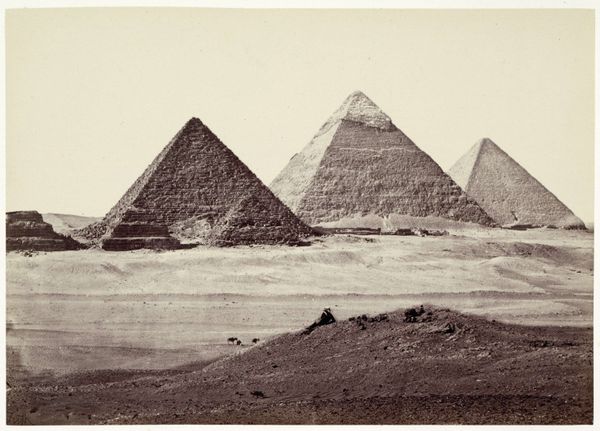 Editor: Francis Frith's "The Pyramids of Sakkarah from the North East" presents these ancient structures starkly against the desert landscape. What do you see in this piece, particularly in terms of cultural memory? Curator: This photograph offers a powerful visual symbol of eternity and the ambition of ancient civilizations. The pyramids themselves are not just monuments, but vessels of cultural memory, encoding beliefs about the afterlife and the divine right of rulers. How does the starkness of the landscape contribute to this feeling? Editor: It emphasizes their isolation and timelessness, almost as if they exist outside of conventional time. Curator: Precisely. And that enduring presence speaks volumes about humanity's attempt to leave its mark, doesn't it? Editor: It certainly does. I never considered it that way before.