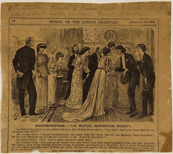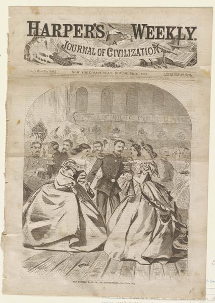 Winslow Homer made this print, titled "The Russian Ball – In the Supper Room," for Harper's Weekly in 1863. It depicts a society event, hinting at the complex social dynamics during the Civil War era. The image creates meaning through its detailed depiction of fashion, social interactions, and the physical setting of the ball. This was a period of immense social change in the United States, marked by the Civil War and shifting class structures. Harper's Weekly was a prominent journalistic institution at the time and Homer's work offers a window into the leisure activities of the elite during wartime. The very fact that such events continued while the nation was at war speaks volumes about the social stratification of the time. Was Homer's image a celebration of these events or a subtle critique? To understand this artwork better, one might delve into the archives of Harper's Weekly, social registers, fashion plates, and other primary source documents of the period. Art, after all, is deeply embedded in its social and institutional context.