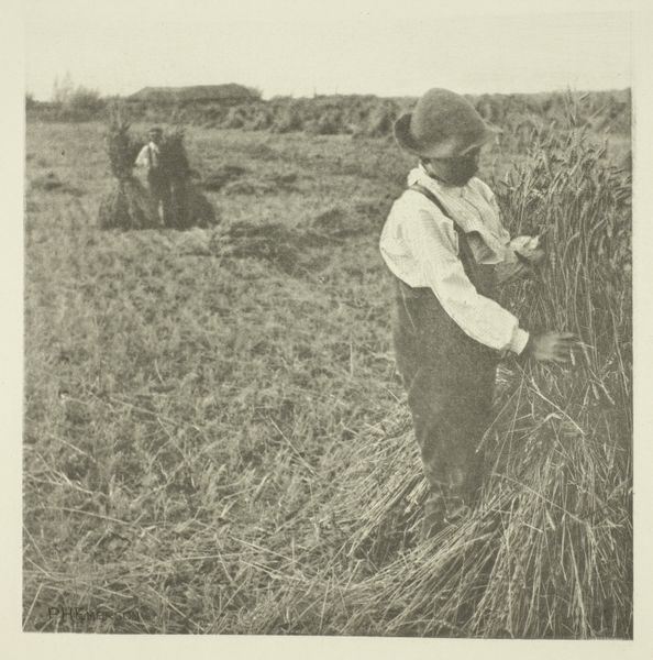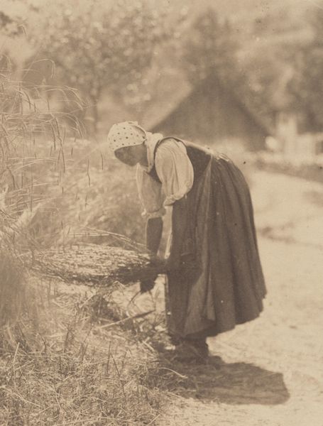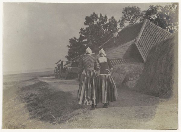Editor: Here we have a gelatin-silver print, sometime between 1900 and 1910, showing "Twee vrouwen in Volendamse klederdracht staand bij een hooiberg"–that’s "Two Women in Volendam Costume Standing by a Haystack"–by G. Hidderley. It's a fascinating glimpse into the past, but I’m struck by how posed it feels, almost staged. What's your read on this photograph? Curator: It’s fascinating precisely *because* of that staged quality. By the turn of the century, photography was no longer just about documenting reality. It was also about constructing it. Consider Volendam itself. It had become a tourist destination, with its traditional costumes and “authentic” Dutch identity carefully curated. Editor: So, these women aren't necessarily spontaneously chatting by a haystack? Curator: Perhaps not. Photographers capitalized on the picturesque, even employing local villagers to pose. The image becomes less about rural life and more about a constructed idea of Dutch identity aimed at the tourist gaze. Look at how carefully their clothes are arranged and consider how the lighting might have been altered. Editor: Ah, that makes sense. I see what you mean about constructing a narrative for outsiders. But are there elements of real life captured, despite the staging? Curator: Certainly. Even a staged photograph can't completely erase the lived experiences of its subjects or the broader social context. What can we glean about the roles and realities of women in Dutch rural society at the time? Consider how their placement within this manufactured image still subtly hints at socio-economic dynamics. Editor: I hadn't thought of it that way. It’s a reminder to question the image and consider who is behind it. I’ll definitely carry this thought when I see this photo again. Curator: Exactly! Looking through the lens of history allows us to decode these layers, finding deeper meanings within seemingly simple images.