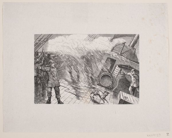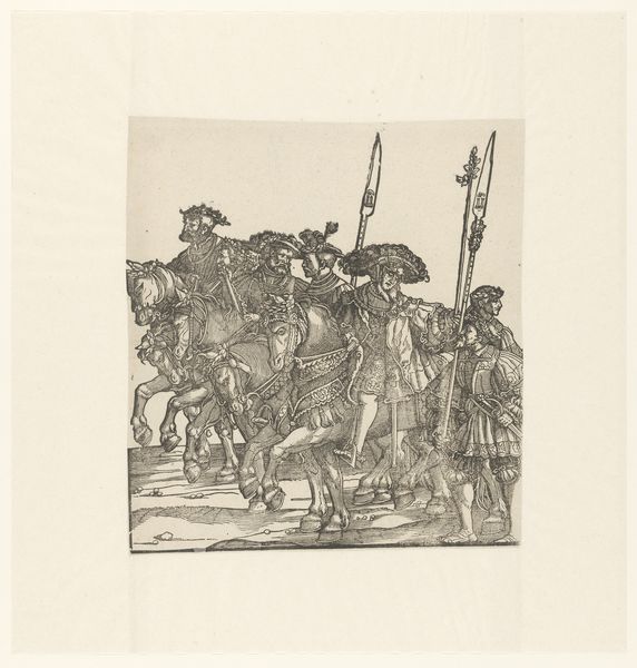 Curator: Before us, we have a print titled "Tweede span van vier paarden" from 1537, created by Hans Schäufelein. It's an engraving, exhibiting characteristics we associate with the Northern Renaissance style. Editor: Wow, the mood is instantly striking! So intricate and somewhat tense. Like a parade gearing up for… something significant. You almost feel the horses’ nervous energy. Curator: Indeed. The work’s historical painting theme situates it within the grand tradition of capturing pivotal moments and conveying underlying ideologies through figuration. The horse, throughout history, is a complicated and celebrated symbol of status and strength. Here the second span of four horses hints at a grand procession. Editor: Absolutely. Looking at the leading figures, what do you make of their rather...serious expressions? It seems like a scene brimming with importance. Almost suffocatingly so! Curator: It suggests, potentially, anxieties related to power, or impending conflict. Renaissance prints often subtly navigated politically turbulent waters through veiled symbolism. We see this with their lances. The weapons point in two opposing directions, perhaps signaling unrest or shifting alliances. Editor: I wonder, could it also be the dawn of the Early Modern period showing its face? I mean, beyond the specific subject, I get this sense of controlled chaos. A world order transitioning into something… else. You know? Curator: Precisely. The engraving, executed with delicate precision, presents us a microcosm reflecting that precise cultural and social tension. These figures stand, perhaps on the cusp of sweeping societal change. Editor: And those details...I feel drawn in by the rich ornamental bridles. What sort of psychology is employed to direct attention like that? I'm distracted by this beauty! Curator: They serve to ennoble the subject. Beauty used strategically is a persuasive force; even, in a sense, a weapon. Editor: Weaponized aesthetics! That rings a bell. You've given me a whole new context through which to look at these images! Curator: My pleasure! May this perspective deepen your appreciation for the emotional, cultural, and psychological depths that reside within it.