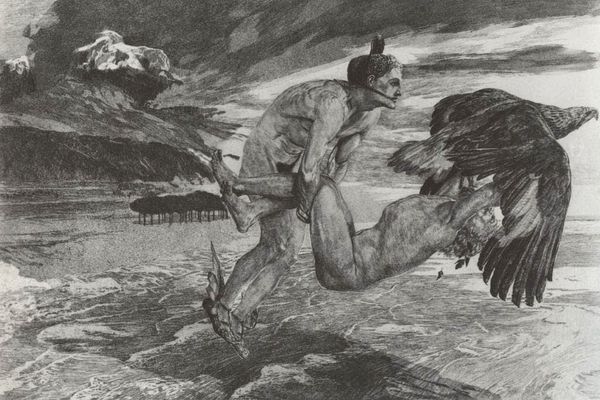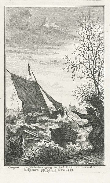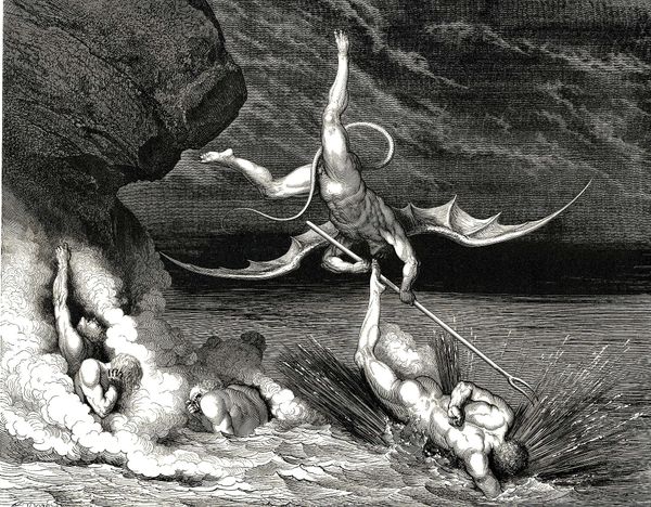 Curator: Today we're looking at "The Adventure with the Windmills" by Gustave Doré, an ink drawing completed in 1868. It illustrates a scene from Cervantes’ Don Quixote. Editor: The overwhelming first impression is one of dynamic chaos. The central figure on horseback appears almost suspended in mid-air, seemingly attacking the enormous windmill looming above. Curator: Doré was, in his time, among the most prolific and successful book illustrators, and his depictions of Don Quixote are incredibly well known. He was also deeply invested in the changing urban and industrial landscape of the era. Editor: Yes, the drawing captures that shift beautifully. I’m struck by the stark contrast between the archaic windmill and the protagonist’s armor against the suggestion of progress with the wings contraption—it feels very poignant and allegorical. Almost surreal. Curator: The composition is quite brilliant. Doré uses strong diagonals and contrasts in shading to convey a sense of movement and heightened drama. The density of the shading certainly contributes to that effect. Editor: Absolutely, and you can feel that sense of imbalance in Quixote's war with the windmills mirrored by an equally uneven system in 19th-century society. There is something rather desperate and sad about it when read as a cultural marker. I find that so fascinating here! Curator: Thinking about its reception, Doré’s illustrations made Quixote relatable to a broader audience, solidifying his status as a celebrated, albeit eccentric, figure within popular culture. Editor: True, but through today’s lens, one might also consider Quixote’s hubris as a cautionary tale against tilting at windmills. We’re now well aware of the complex economic realities behind social inequalities that render social activism not as tilting at windmills. Curator: The work’s impact can be measured not only by Doré’s impressive skills but also by his enduring representation of this famous literary figure. Editor: Ultimately, I see this piece as capturing both a literal narrative and providing commentary about the sociopolitical conditions during Dore’s time. An adventure immortalized. Curator: I'd agree, and it also captures the public imagination. A narrative that transcends its origin through accessible art.
