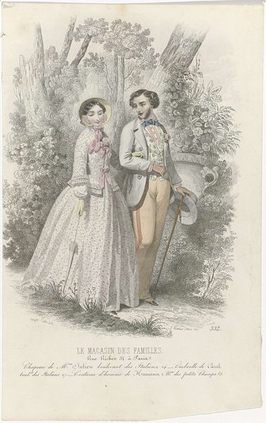 Curator: What strikes me immediately is the quiet formality, yet a slight sense of the absurd. Editor: Yes, let’s contextualize this piece. This is a print titled "O Civilisador, ca. 1859, 3o Anno, No. 16," made around 1859 by Henrique Barreto. It appears to be an engraving. The title itself, "The Civilizer," carries a heavy ideological weight, doesn't it? Curator: Indeed. That title paired with their stern faces makes me wonder, what kind of civilization are we talking about here? The details in the woman’s dress are captivating; each fold, each trim… they seem so purposefully placed, but feel slightly artificial. Editor: Think about the 19th century and Brazil's position within a global network of power. The artist, Barreto, was actively involved in the theater. He also had a printing shop in Rio. Images like this are crucial for understanding how the elites saw themselves. The dress, the tailcoat, the letter each prop becomes symbolic of progress. The whole scene has a rigid structure. Curator: I sense an unease or a discomfort, in the rendering and the setting. Are these the true bearers of civilization, or is Barreto slyly suggesting something else? The shadows are too harsh! Editor: The inclusion of certain groups and the exclusion of others, based on race, class, and gender is central. Consider also the power dynamics embedded in the act of portraying oneself as a "civilizer." It’s deeply entrenched in colonialism and patriarchy. Curator: It feels very posed, almost like actors on a stage set; as though the "civilizing" influence that they might exert will play out in a highly controlled way. It makes one want to disrupt things a bit, to deconstruct such rigid presentations. Editor: This artwork makes visible certain social performances and structures of authority that still impact us today, so it serves as an enduring piece of cultural commentary. Curator: Agreed. Its power lies precisely in this quiet yet forceful statement about control and its impact, leaving us to question how "civilized" it all truly is.