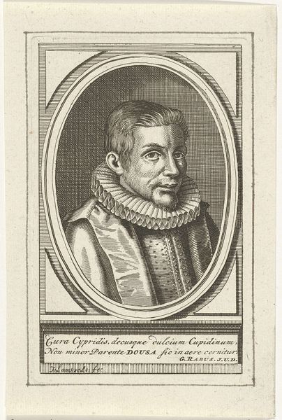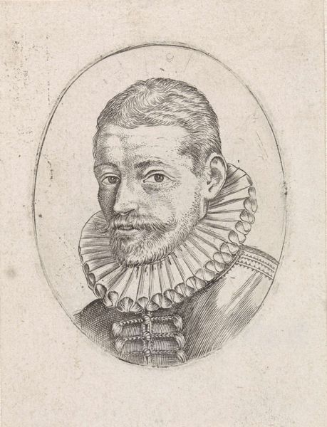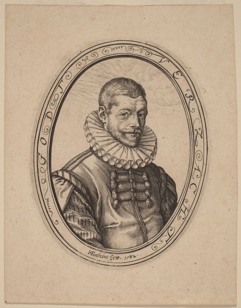 Editor: Here we have Hendrick Goltzius’s “Portret van Hans Felbbier of Jacob Gyscher” from 1582, housed at the Rijksmuseum. It’s an engraving on paper. It's a striking image; the man's gaze is quite direct. How would you approach an interpretation of this print, focusing on its form? Curator: Considering its formal elements, we can deconstruct this engraving using a semiotic lens. Notice the contrast between the intricate details of the ruff and doublet versus the relatively plain background. What meaning might be derived from that contrast? Editor: Perhaps it's emphasizing the sitter's status and wealth through intricate textures against simplicity? Curator: Precisely. Furthermore, the oval frame containing the subject serves to isolate and elevate him. Note the inscription encircling the frame, carefully etched. Its visual weight contributes to the overall composition and narrative. What message do you think it might communicate? Editor: I hadn't considered that it could be narrative. Is the inscription providing information about the man depicted, further emphasizing his identity? Curator: It is possible, yes. The carefully constructed lines create form and shadow. Observe how Goltzius uses cross-hatching to model the face and give depth to the figure. Are you familiar with structuralist interpretation techniques of linearity and definition? Editor: Not thoroughly, I'm afraid. Could you perhaps share a formalist view on its effect here? Curator: Absolutely. In structuralist terms, the linear marks structure and create oppositions, the stark contrasts define more complex notions about form. Ultimately, the combination is critical to its interpretation and, subsequently, its lasting legacy. Editor: Thank you, I found the way that you decoded its features absolutely fascinating. I learned a great deal. Curator: Indeed. Focusing on structure enriches understanding, prompting exploration.