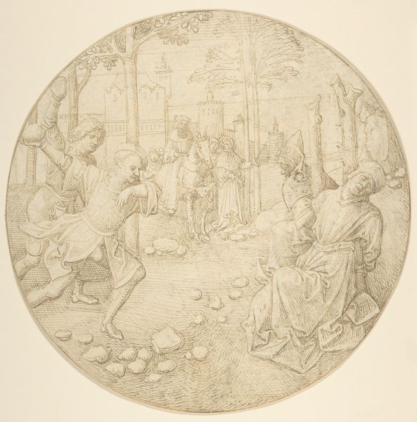 Editor: Here we have Aristide Maillol’s "Tapisserie" from 1895, rendered in ink on paper through etching and engraving. It reminds me of something ancient, like a frieze fragment pulled from a wall. What first strikes you about this piece? Curator: It immediately conjures echoes of classical Greece. Notice the arrangement of the figures; the tapestry-like border containing a scene… the simplified, flowing lines… All evoke a specific sense of idealized beauty, harmony, and order. How do you think Maillol employs this classical imagery? Editor: Well, the figures, draped in what looks like classical garb, are posed serenely. There's an overall calmness. Yet, framing it as a "tapestry" adds a layer, doesn't it? Is he commenting on how we frame history itself? Curator: Precisely. Tapestries are, after all, records – stories woven into cloth, often depicting significant historical events or myths. By titling it "Tapisserie", Maillol invites us to consider what stories he is trying to weave, and what elements he chooses to emphasize or omit. Observe the detail, how everything is framed within a very tight boundary, a border. What effect do you believe that gives to the image and the cultural context it attempts to recall? Editor: It feels contained, like a memory carefully preserved but perhaps also a bit…static. The women don’t really interact, almost like archetypes frozen in time. Curator: Good observation! Perhaps Maillol suggests that our understanding of the classical world is mediated and shaped by representations. This wasn't created during antiquity. Instead, what is seen in the context of late 19th century France when new archaeological findings changed how people viewed antiquity? How might those social and political factors influence how Maillol interprets the cultural memory of antiquity? Editor: It’s fascinating how the title itself shifts our perception, adding a layer of self-awareness to the whole composition. Curator: Indeed. It makes you consider how artists grapple with cultural inheritance.