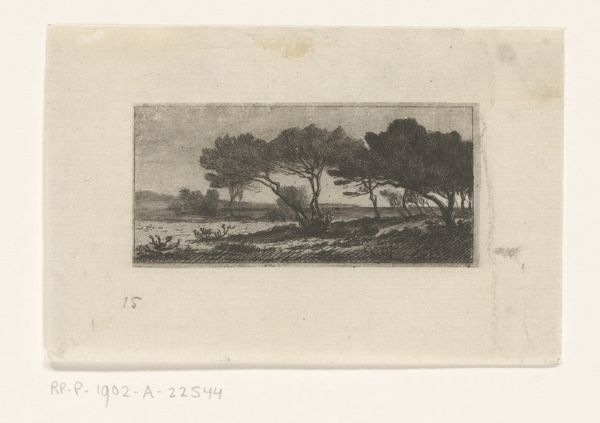 Carel Nicolaas Storm van 's-Gravesande created this print, "Two Depictions of Pine Trees on the Coast, and Seven Etching Tests," using etching techniques. Born in the Netherlands during the height of its colonial power, van 's-Gravesande lived through a period of significant social and economic change. At first glance, the print appears to simply depict natural landscapes and technical tests. But consider the cultural context in which van 's-Gravesande was working. During the late 19th century, European artists often depicted nature through a lens of Romanticism, idealizing landscapes as symbols of national identity and colonial power. The pine trees, stoic and resilient, might represent the strength and endurance of the Dutch spirit. The technical tests on the side could reflect the artist's meticulous exploration of his craft, mirroring the era's emphasis on scientific advancement and industrial progress. The print invites us to contemplate the relationship between nature, identity, and progress, reflecting both the beauty of the natural world and the complex social forces that shaped its perception.