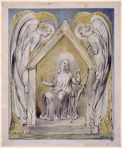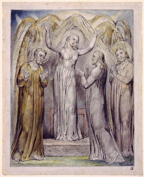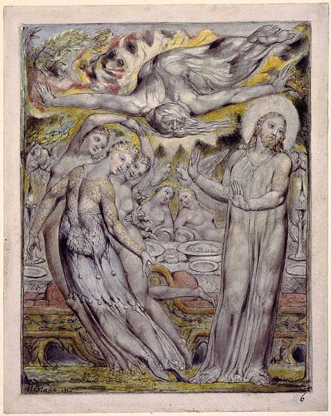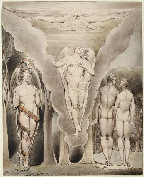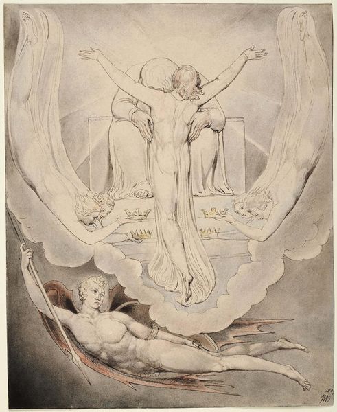Curator: Here we have William Blake’s "Angels Ministering to Christ," a watercolor drawing from around 1820. It's part of his biblical series. Editor: My initial reaction is one of ethereal solemnity. The composition feels almost like a vision, with those radiant figures surrounding a central Christ figure. There's a definite sense of heightened spirituality. Curator: Blake's personal mythology is all over this. The visual language he employs—those elongated figures, the dynamic, flowing drapery—they're not just aesthetic choices. They express a deeply personal, and at times, politically charged spiritual worldview. Consider the socio-political radicalism underpinning much of Blake's art and poetry: the Church was the establishment, right? So how does Blake position the meek and the divine here? Editor: Yes, the symbols feel rich. We have angels bearing the Eucharist symbols – bread and wine – emblems of sacrifice, communion. I am also intrigued by Blake's conscious use of Christian imagery intertwined with a much older iconographic system where sacrifice, divine redemption, and apotheosis are recurring themes. Curator: Absolutely. And that sense of dramatic unveiling in the watercolor—the subtle gradations, the light emanating from Christ— it amplifies the drama and emotion, drawing from Romanticism and maybe challenging orthodox religious perspectives, especially during a period defined by sharp societal stratification and oppressive governance. Editor: Precisely. It goes back to the psychology of symbols – it does not reside solely in their prescribed religious meanings but in the emotional resonance they stir in the viewer. What I perceive are the universality of love and compassion; it suggests an inclusive spiritual interpretation – perhaps something radically distinct from institutional rigidity of the time. Curator: Perhaps Blake’s subversion isn’t overtly in the visual iconography but in how his distinct Romantic visual style decenters orthodox perspectives, offering a new, potentially feminist-angled reading on ministering through his distinct stylistic lens. Editor: Interesting point. As we wrap up, what strikes me most is Blake's unique capacity to blend personal vision with shared cultural iconography into a single arresting, vivid expression of transcendent solace. Curator: Yes, Blake’s choice to depict the vulnerable side of the divine resonates in an era calling for societal change. A testament, undoubtedly, to the ever-shifting nature of theological and socio-political representation.
