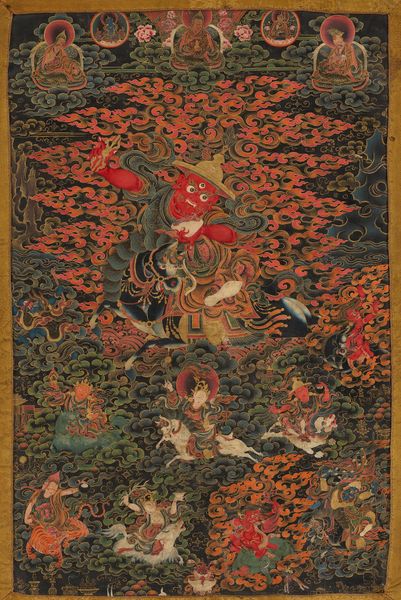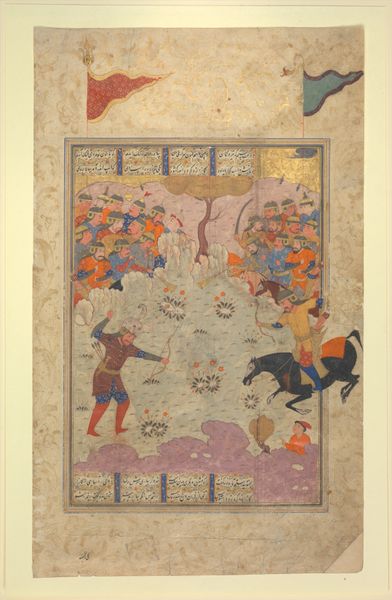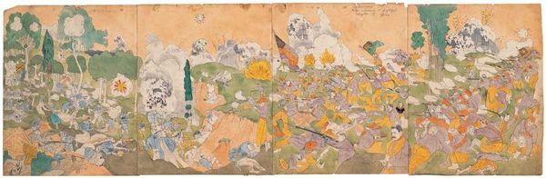 Curator: Oh, the textures in this piece, they hum like a well-played balalaika. Editor: Today we're looking at Ivan Bilibin's "Illustration for the epic 'Exile Khan Batygi'," a mixed-media work from 1941 that pulls from both the Russian Avant-Garde and medieval styles. The painting depicts a rather dramatic scene of battle. Curator: Dramatic is an understatement. It feels like controlled chaos. So much is happening, and yet the detail… like, the tassels on the horses! But all those figures pressed together give me a feeling of… unease. Almost claustrophobic despite being a landscape. Editor: The epic poem tells a tale of power and exile, set against a backdrop of warring factions. Given its creation during World War II, do you think the painting subtly comments on the sociopolitical atmosphere? It could be interpreted as resistance and historical reflection at a time when storytelling served as cultural preservation. Curator: Well, art is always reflecting something back at us, right? You know, looking closer, it reminds me of a stage play – all the figures presented in layers, like actors on a tiered platform. Editor: Indeed. Think about the strategic deployment of color. There's a dominance of greens, golds, and blues... typical of much Asian art, each playing its role to express cultural motifs and narratives. Curator: What I appreciate is Bilibin’s devotion to narrative—the visual weight given to each player in the drama is rather delicious, like each stroke sings a tiny song. What stories! The textures give you something new to discover with every look. Editor: Bilibin invites us to question power, delve into cultural memories, and assess how historical reflections translate onto our current experiences. It bridges past and present in one layered vision. Curator: It makes you think about who’s telling the stories of our time, who is writing the epics that will become our shared memories. I find it all strangely uplifting. Editor: Art as activism and reflection. An enduring invitation to remember, reimagine, and resist.