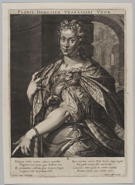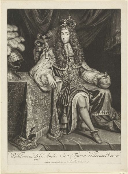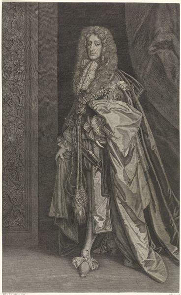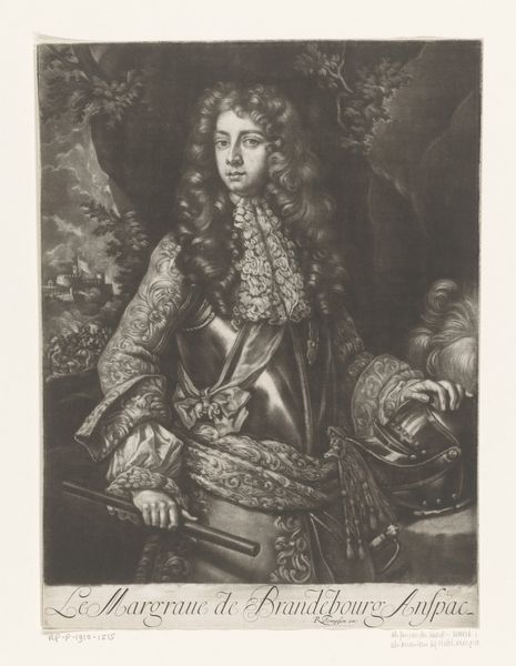 Curator: I find this Baroque portrait fascinating, especially the way Jan van der Vaart, working sometime between 1657 and 1693, captured the sitter’s likeness using line engraving. It’s titled "Portret van Robert Fielding" and resides in the Rijksmuseum. The detail is just stunning, wouldn’t you agree? Editor: There's a languid opulence to it. He's so draped in fabric and wearing a magnificent wig! The pose feels… contrived, yet it speaks volumes about the sitter's social position. He’s practically dripping in signifiers of wealth and status. Curator: Absolutely. Notice how Fielding’s hand gestures almost offer something to the viewer? It's a common symbolic trope suggesting generosity or power, inviting a relationship with the observer, but what's curious is his gaze doesn't match the offer. It doesn't convey warmth or engagement. Editor: Exactly! The setting too: the drape, the suggestion of a column…it creates a carefully staged drama of class and hierarchy. Look closer. The landscape peeks out behind him in a blur as he floats upon this manufactured fantasy of entitlement, a common tactic within these types of Baroque Era displays of wealth. What does it mask? What does it really tell us about power at this point in history? Curator: Perhaps the artifice reflects the shifting grounds of power in that era. Baroque portraiture often functioned as propaganda, so Fielding could be posturing. Look, the clothing symbolizes rank and profession, but could just as easily be aspirational costume. Do you agree that this is the type of "persona" one expects from a person in position? Editor: Or it underscores the fragility of constructed identities. A single work might act to reflect the deep chasm in a class divided social stratum: those who could, and those who certainly could not ever obtain the same resources and affectations. There's an anxiety in this level of performance and accumulation. The symbols feel heavy, even forced. Curator: The genius is, Vaart captures that very tension within Fielding. Thank you for the rich contextual layer you brought to our understanding of this work! Editor: My pleasure. This image is yet another reminder that visual culture continues to be integral to broader issues of power, identity, and resistance.