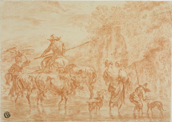 Editor: Here we have "Three Arab Horsemen Crossing a River," a charcoal drawing made around 1835 by Alexandre-Gabriel Decamps. I’m really struck by the muted tones, the somber feeling. It feels almost secretive, like we're witnessing something we shouldn't be. What leaps out at you when you see it? Curator: Secretive, yes, like a hushed memory trying to surface. For me, it’s the light – how Decamps uses it. Notice how the faint shimmer on the water and sky suggests a moon hidden behind clouds. He draws us into this twilight space, doesn’t he? You can almost smell the damp earth and hear the soft splash of hooves. He seems to be less interested in a literal depiction and more with the atmosphere and emotional resonance, wouldn't you agree? Editor: Definitely! It's like he's prioritizing feeling over precision. I read that he's considered an Orientalist painter. Does this fit into that genre, in your opinion? Curator: Absolutely, though with a touch of melancholic Romanticism perhaps. Orientalism in art was often about Europeans imagining and representing the ‘East’. But look closely – is this just an exotic fantasy? Or is Decamps striving for a deeper understanding, using light and shadow to explore themes of journey, crossing borders, perhaps even a hint of longing for the unknown? Or maybe it's about the in-between, that liminal space both geographical and emotional, which many artists try to capture in different eras... What do you think? Editor: That makes me reconsider my initial reading. The 'in-between' is a lovely way to describe it, like the riders are caught between worlds. Curator: Exactly! I initially felt it was very good, now it is absolutely outstanding work, isn’t it? Editor: It is! I came in seeing a somber scene and now I'm leaving with a sense of adventure and possibility. It's amazing how much more there is to discover beneath the surface.