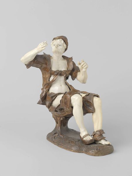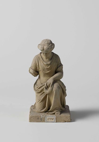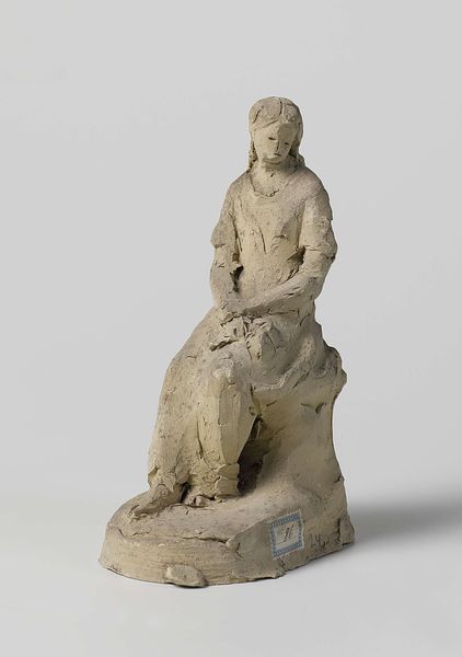 Curator: This is Eugène Lacomblé's wooden sculpture, "Ontwerp voor een standbeeld van Moliere," created sometime between 1800 and 1900. Editor: It has an unassuming air, a study in repose—yet there's a certain weariness etched in his downturned gaze. The weight of expectation, perhaps? Curator: Certainly, his downcast posture suggests contemplation rather than celebration. It deviates from typical heroic depictions, prompting us to consider the artist's intent in portraying Molière with such understated grace. The folds of his garments are deeply etched, characteristic of Baroque era figuration, hinting at interiority as much as physical presence. Editor: I’m drawn to think about what representation meant for someone like Moliere, in the theatrical context. While, here, he appears as a passive observer, we know that Moliere made incisive attacks on the establishment through comedy, so this more muted representation of the playwright feels like a conscious statement, particularly when viewed from a historical vantage. Curator: The absence of vibrant colors heightens that introspective feel, focusing instead on texture and form, as the material carries meaning too. The use of wood introduces a natural, human element, quite different from the cold monumentality one might expect in, say, marble. This adds layers to our understanding of how artists negotiate fame and remembrance. Editor: Precisely. There's an interesting tension here. By softening the public persona, it opens up possibilities for connection. Is it designed to reveal, or to perhaps conceal something of Moliere the performer, the artist? It also prompts considering broader social dynamics around censorship. Moliere challenged existing power structures through theater, in some ways becoming like a revolutionary symbol of defiance for the ordinary citizen. Curator: I appreciate how this sculpture prompts introspection. Molière remains an influential figure; it serves as a timeless echo connecting us across centuries, urging us to examine ourselves. Editor: And for me, it encourages dialogue between art history and contemporary theory—thinking more deeply about social constructs, like identity. How are these intertwined with an artwork’s impact? It also makes one wonder how Moliere himself would have received this less conventional portrayal of his image.