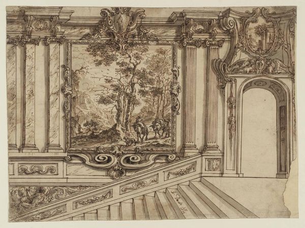 Editor: This etching, "Rococo Palace with Fountain, Waterfall, and Stairs," from 1738-1749 by Gabriel Huquier, presents an incredibly ornate scene. It's so intricate; my eyes want to trace every line and flourish. The effect, though, is a little… dizzying? What do you see in it? Curator: Dizzying is a fantastic word for it. I feel the same sense of delightful overwhelm. For me, it’s like stepping into a dream, perhaps one inspired by a theatre set. The scale is playful; those figures milling about almost seem like they're acting out a silent scene, don’t you think? It’s pure fantasy, but anchored in an architectural understanding of the time, which is so typical for the Rococo. It's lighthearted, even as it overwhelms. Editor: Theatre set is a great way to think of it, especially since there seem to be an audience within the arcades themselves. Why architecture rather than sculpture, would you say? Curator: A drawing like this reveals a passion of the period: stage design and architecture blending as pure entertainment. These fountains weren't just fountains. They were about spectacle. Did they really think to construct something like that? That's where imagination dances, darling. Think Versailles on steroids. It makes me smile, don't you think? Editor: It does now! Initially, I was just caught up in the details. Thinking about it as theatre and a vision helps bring it to life and gives context to its style. Thanks! Curator: Exactly! And for me, that's what experiencing art should be, a two-way street to another's intentions and experiences. I appreciate seeing this etching, I have had an amusing experience, and the theatre stage thought is stuck in my head now.