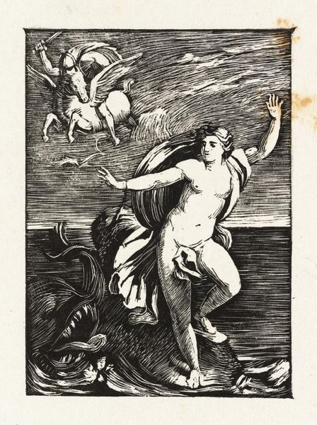 Editor: This is "Thetis," an engraving by Hendrick Goltzius from around 1590. The tonal contrasts create such drama, and the oval format feels so self-contained. I'm really drawn to her gaze and wonder about her story. How do you interpret this work? Curator: This engraving pulsates with symbolic weight, doesn’t it? Notice how Thetis, a sea nymph, is presented not just as a beautiful figure, but as a visual embodiment of Mannerist ideals—exaggerated musculature, a dynamic pose that defies naturalism. What do such distortions convey to you? Editor: It’s like she’s meant to be seen as almost superhuman, larger than life! The way she dominates the composition, too, makes her feel very powerful. Curator: Precisely. Now, consider the dolphin. In Renaissance imagery, it often symbolized speed, diligence, and love. Does its presence, along with the tumultuous sea behind her, enhance your sense of Thetis’ dominion over the waters, but also, perhaps, over her passions? Editor: Yes, I see that now! The dolphins are both regal and very active in the churning sea. And if the ships in the background symbolize struggle and progress, is Goltzius suggesting Thetis controls those aspects of life? Curator: That’s a keen observation. Thetis’ narrative ripples outwards. She not only embodies ideals of beauty and power, but also becomes an anchor point for the era’s understanding of the sea, fate, and the interplay of human ambition and the elements. It's about so much more than the ocean itself. Editor: This makes me think about how much we read into these images! I now feel as though I know more about cultural storytelling through symbols. Curator: And perhaps we both understand a bit more about how the past uses images to hold cultural memory.