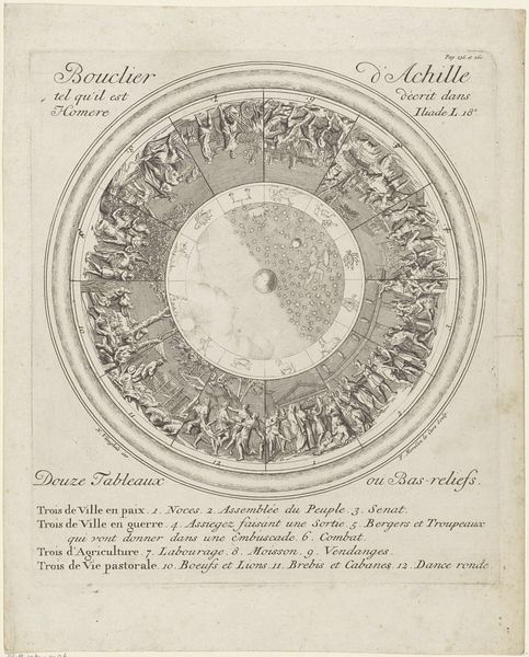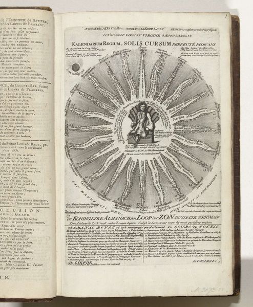 This is an anonymous print from 1705, titled "Koninklijke Almanak van Lodewijk XIV." The print is dominated by a circular composition, echoing the cyclical nature of time itself. Emanating from the figure of Louis XIV, rays project outwards, each inscribed with text forming the shape of a sun. The visual organization reflects a structured and hierarchical view of the world, typical of the era. The central placement of Louis XIV suggests not only his political power but also a symbolic alignment with the sun, a classical metaphor for kingship and divine authority. The almanac functions as a semiotic system, using the sun's path to frame political messaging and to reinforce the king's central role in the cosmic and social order. Consider how the formal structure of the print, with its ordered arrangement and symbolic imagery, communicates a vision of power and knowledge intertwined. The artwork invites us to decode the cultural codes embedded within its design, revealing the complex interplay between art, power, and representation.