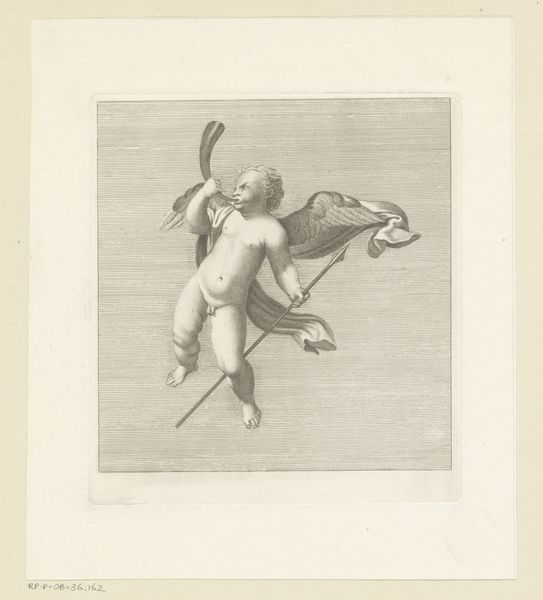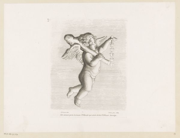 Editor: This engraving, "Amor met pijlenkoker van Hercules" from 1678 by Jean Pesne, features a cherubic figure hugging what appears to be a quiver of arrows. It’s delicate, almost fragile, yet something about the image feels strangely powerful to me. What stories can we unpack from these symbols? Curator: Indeed. The combination of Amor, the god of love, associated with Hercules' quiver, laden with his strength and labours, creates an intriguing tension. Consider Hercules, a symbol of might and heroism – then juxtapose him with Amor, the instigator of passion and sometimes irrational decisions. What does that suggest about the nature of love itself? Editor: That love can be a powerful force, maybe even as formidable as Hercules? The quiver also has a series of ornaments depicting different scenes; is there something else? Curator: Precisely! These aren’t merely decorative elements. Look closely; each little scene could be another coded reference, a symbolic reminder of various trials and tribulations or perhaps heroic achievements which Hercules went through. By giving the quiver to Amor, is Pesne suggesting that love too has its own labors, demands its own strength? It is definitely open to a variety of interpretations. How do you see it? Editor: I never considered it in that way! Now it appears that, while delicate and romantic, it conveys power. Curator: The visual language of art provides constant dialogue. Seeing how symbols converge and transform gives me great pleasure. The Baroque period greatly enhanced this form of symbolism. Editor: It's fascinating how just a simple cherub with borrowed iconography tells such a rich story about human passions. Curator: Symbols do that. That image will stay with me for a long time. I like it!