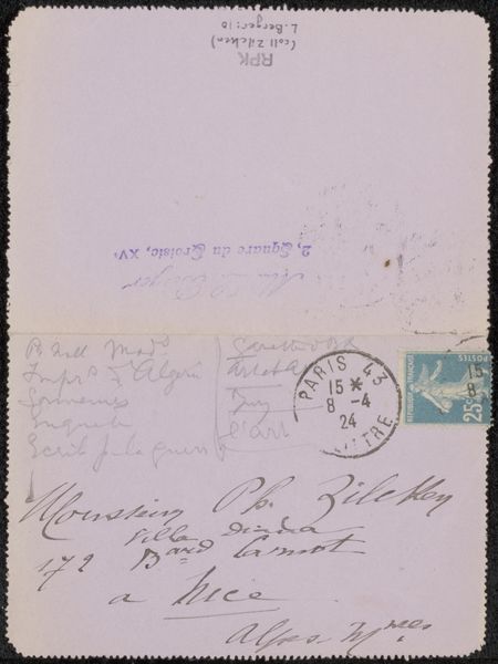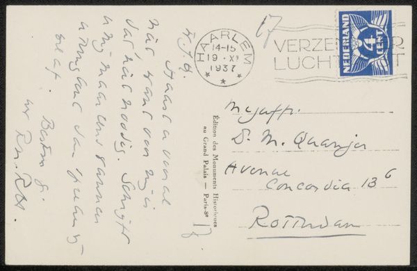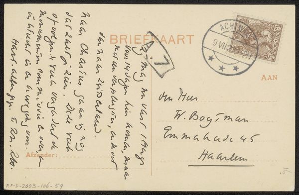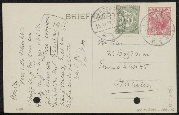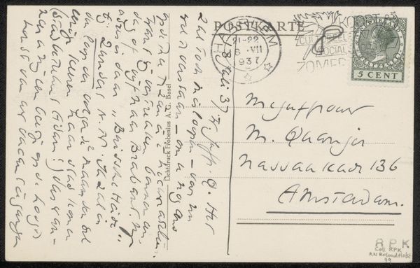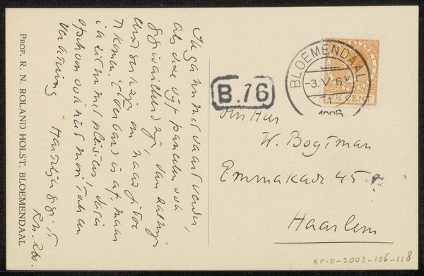 Editor: Here we have Richard Nicolaüs Roland Holst’s “Briefkaart aan Willem Bogtman,” likely from 1926. It's ink on paper and appears to be the back of a postcard with a handwritten message and some pen sketches. The quick, almost frantic handwriting makes me wonder about the context of its creation. What stands out to you in terms of its historical or cultural significance? Curator: This postcard offers a fascinating glimpse into the artistic networks of the early 20th century. Roland Holst, a prominent figure in the Dutch Symbolist movement, corresponded with many artists and intellectuals. The quick, informal nature of the postcard medium itself speaks volumes. In an era before email, it served as a rapid and accessible means of communication within artistic circles. Note the address it was sent to; I wonder, was Emmakade 45 a well-known artistic hub? Editor: That’s interesting! So the postcard isn’t just a message, but a little piece of social networking in action. Curator: Precisely. And notice how the handwriting, the stamps, and even the ink become carriers of meaning. The Dutch postal system at the time was deeply integrated into society. Postcards were very common but also represented bureaucracy and authority. We see the hand-drawn characters contrast with the formal address and pre-printed postcard banner. In this regard, the “Briefkaart aan Willem Bogtman” operates as a piece of anti-establishment art by rejecting formality in an effort to achieve real, artistic community. Does knowing all that influence your sense of its overall mood now? Editor: It does, actually. What first seemed like frantic energy now seems more like an intimate exchange defying social norms. I’m glad I got to reconsider my initial read! Curator: And I find myself appreciating Roland Holst's ingenuity and subversive style all the more by looking at it with you. Thank you!