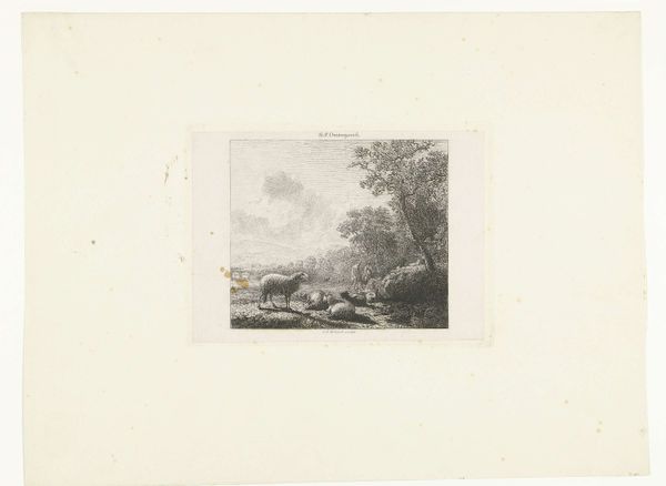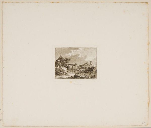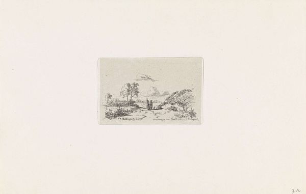 Curator: Jacob Wilhelm Mechau, a German artist active in the late 18th and early 19th centuries, created this piece; it's called Plate Four. Editor: It feels like a scene from a traveler’s journal, a quick sketch of a windswept landscape. Somber, almost desolate. Curator: Mechau was known for his landscape etchings, often depicting pastoral scenes idealized through a classical lens. This plate reflects the period’s fascination with nature and the picturesque. Editor: Look at how small the figures are compared to the vastness of the scene. Are they dwarfed by the elements or simply disconnected from the land? I see a tension between human presence and natural power. Curator: The composition follows conventions popular at the time, drawing on ideas about how landscapes should be composed for aesthetic and moral impact, and how they were sold to the public. Editor: It makes me think about land ownership, even. Who gets to represent the landscape, and whose stories are left out of these idyllic scenes? Curator: It’s a reminder of the complex relationship between art, nature, and the social structures that frame our understanding. Editor: Indeed. Art can never truly be divorced from the cultural moment in which it’s created.