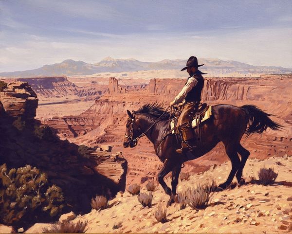 Mark Maggiori’s "Canyon Del Muerto" is a painting of the American West rendered with a real love for its dusty, sun-baked hues. You can tell right away that painting is a process for him. Look at the way the horse’s shadow stretches, a dark inky pool on the orange rock. It’s a simple shape, but it speaks volumes. The paint is applied in layers, creating a depth that feels almost tactile. The colors aren’t blended perfectly, which gives the whole scene a raw, unfiltered quality, like a memory half-forgotten. It’s like Maggiori is saying something about how we remember landscapes, not as picture-perfect postcards, but as collections of textures and light. Maggiori shares a vision with Maynard Dixon, another painter who saw the West not as a spectacle, but as a place of quiet, enduring beauty. And that’s what makes this painting so compelling - its embrace of ambiguity.