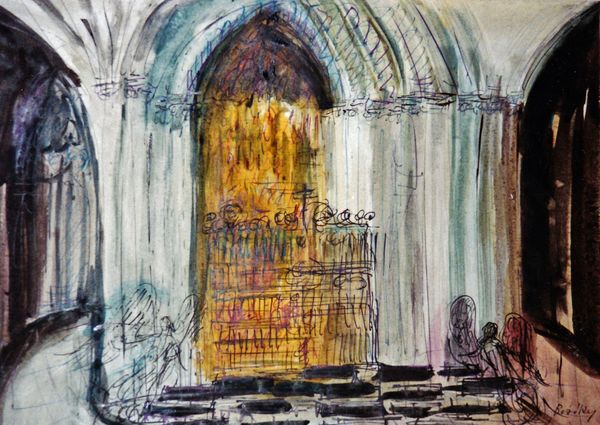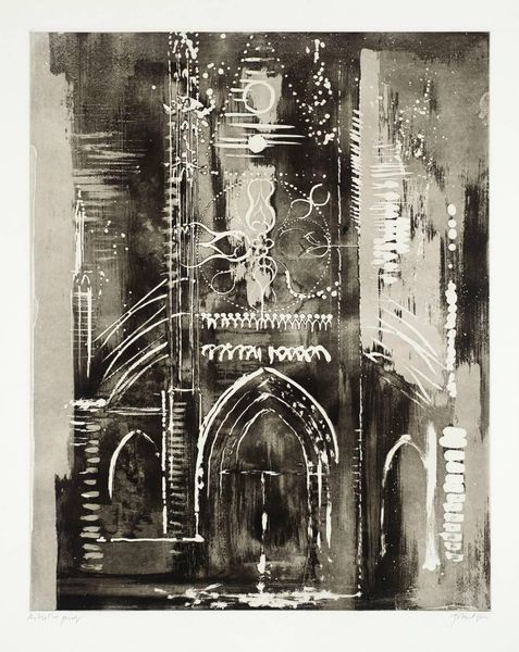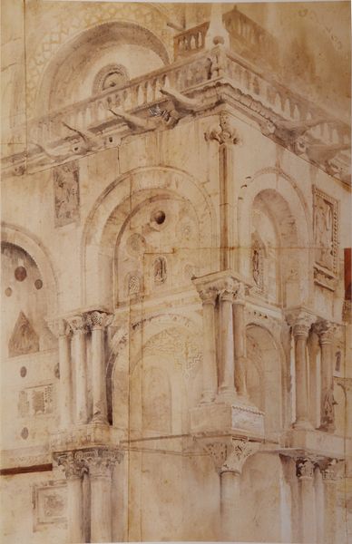 Editor: This drawing, “Saint Stanislaus” by Leon Wyczółkowski, dating from 1911-1912, uses pencil to capture this monumental architecture. I find the composition, with its stark contrast between the dark, heavy stone and the golden, ethereal archway, so striking. What aspects of this piece do you find most compelling? Curator: Well, let's consider the means of production. The stark contrast you mentioned isn’t just visual, it's material. Graphite pencil, a relatively accessible material even then, is used to depict this monumental, likely expensive structure. It begs the question: who was this image intended for? Was it a study, a print for wider circulation? The very act of rendering opulent architecture in humble graphite brings up social and economic tensions. Editor: That’s an interesting point. So the choice of a "lowly" material challenges the traditional view of the church as inherently elevated or separate from the everyday lives of ordinary people? Curator: Exactly. Wyczółkowski’s choice to portray this grand edifice in a simple drawing implicates the artist and, potentially, the viewer in a dialogue about power and access. Think about the labor involved in quarrying the stone, carving the ornamentation – versus the relative ease of producing this image. Is it critical or celebratory? Perhaps both. What do you notice about the differing applications of pencil to create contrasting textures? Editor: I see that the stone textures are quite rough, with visible strokes, but the gold appears much smoother, almost blurred...it's quite captivating, but also strange that it appears that the stone portion took greater time, effort, and care. Curator: And what does that contrast in finish suggest about the relative value Wyczółkowski ascribed to these differing materials and structures? Remember, this was a time of immense social change, and Neo-Impressionism sought to capture not just optical sensations, but also deeper, perhaps political, realities. Editor: I hadn't considered the materials themselves as carriers of meaning, not just as tools for representation. I am taking new meaning away from this listening. Curator: Indeed. By examining the process and material choices, we unlock a richer understanding of the work’s place in its social and historical context.