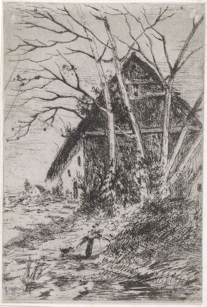 Curator: Menzel’s "Barns in Interlaken" just draws you in, doesn’t it? I love how the charcoal practically vibrates. Editor: Absolutely, but what I see is a document of rural labor and land use. These barns aren't just picturesque; they signify an entire social structure. Curator: Maybe, but the way the light filters through the timber… it’s like he’s captured a fleeting moment of serenity. It almost feels impressionistic. Editor: I wouldn’t go that far. Menzel was more invested in realism. He's showing us the bones of a working landscape, the infrastructure upon which society rests. Curator: True, and that skeletal feel is appealing in a way. It has that stark beauty that almost feels… vulnerable. Editor: Exactly, vulnerable to shifts in economy and policy. It is not about just beauty, but the fragility inherent in rural life. Curator: Well, regardless, I’m glad he captured it. Makes you appreciate the past and all the work that went into it. Editor: Agreed. It reminds us to look beyond the surface, to see the layered meanings behind even the simplest scenes.