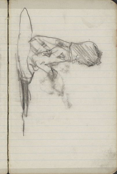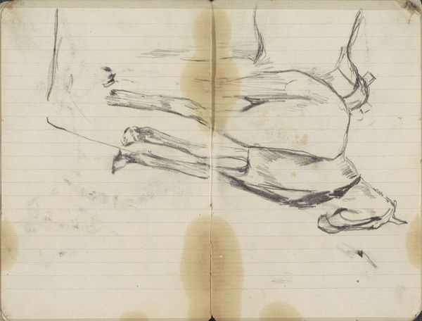 Editor: This is *Studieblad, mogelijk met katten*—Study Sheet, Possibly with Cats—created around 1894 by George Hendrik Breitner. It's a pencil and graphite drawing on paper, and it strikes me as a very quick, almost ephemeral sketch. What do you see in this piece, considering its apparent simplicity? Curator: Its power resides precisely in that perceived simplicity. Observe the textured layering of graphite; Breitner isn't merely outlining forms, he’s building up tonal masses, exploring light and shadow with economical yet deliberate marks. Note the dynamism achieved with such sparse linework; the very act of sketching conveys movement. How does the visible page and the lines contribute to this dynamic? Editor: I guess the lined paper emphasizes the sketch-like quality. It reminds me it's just a quick study, not a finished piece. Curator: Precisely. The grid of the page interacts with the free, gestural marks, creating a visual tension, while the visible mechanism binding the pages serves to highlight the work's raw, almost accidental character. One could even interpret the drawing as a semiotic exercise, with the marks becoming signifiers for form, motion, and potential narrative. It prompts contemplation on how line and form work to indicate presence, or being. Editor: So, it's not just a sketch of cats; it’s a study of mark-making itself? Curator: Indeed. Breitner’s mastery is evident in how he elevates this everyday subject into an exploration of pure form, line, and tone, showcasing a sophisticated engagement with the inherent qualities of the medium. Consider the deliberate choices within the composition - what do you see? Editor: I see a complex arrangement of simple pencil strokes...it makes me think about how much information you can convey with very little. I hadn't considered it so carefully before. Curator: That close formal attention is invaluable. Thank you for that close observation. Editor: Thanks to you. It definitely makes me appreciate what looks simple on the surface, and notice the composition within sketches.