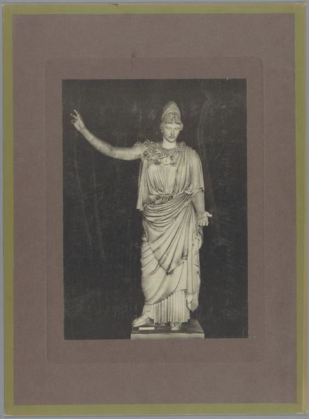 Curator: It has a quiet, mournful beauty. A photograph of a terracotta sculpture… somehow fragile and powerful at the same time. Editor: Indeed. This image, known as "Terracotta Sculpture of Juno or Venus", captures a moment of classical art viewed through the lens of 19th-century photography, predating 1857, by Marcel Gustave Laverdet. Curator: I’m particularly drawn to the figure’s draped garments, the subtle folds and how they cling to the body suggest so much. The rendering has an evocative quality. I wonder about the specific gesture of her raised hand. Editor: Such depictions, Juno or Venus, frequently played with ideals of beauty, womanhood, and divinity within the strict social mores of the time. Its appropriation for photographic study is interesting because of photography’s increasing importance for scholarship and documentation. Curator: Right, it almost becomes an icon of the classical, reproduced and reinterpreted. But the surface of the terracotta is key; it gives that tangible weight. Editor: Absolutely, you are noticing how the interplay between the coolness of the photographic medium and the warmth implied by the terracotta hints to broader questions around cultural preservation and access, it echoes broader debates about authenticity, about art history itself as an authoritative discipline Curator: Thinking about Juno and Venus and how these icons appear again and again. How do we continually engage and transform ancient ideas? The statue seems to say it, this is timelessness materialized Editor: The act of photographing sculptures like this underscores a democratizing impulse—making these cultural touchstones accessible to a wider audience through reproduction, a form of democratization by technology. Curator: In that light, photography isn't just reproduction but cultural participation—we begin to internalize art that way. I see echoes of generations finding something of themselves within these statues. Editor: I think that connection of personal experience to cultural artifacts explains how such images became ingrained within visual literacy and collective imagination. A visual echo felt long afterwards.