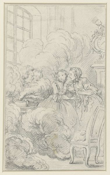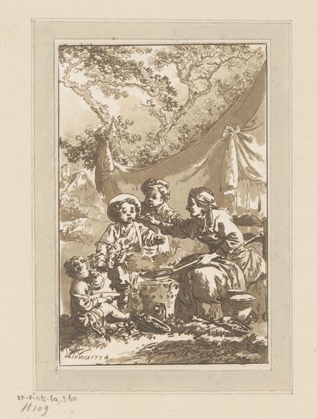 Editor: This is "Taste" by Jean-Baptiste Le Prince. It’s a small print featuring children being fed, and it feels very intimate, almost like a glimpse into a private moment. What do you see in this piece, with its title “Taste?" Curator: I see echoes of the domestic Madonna, wouldn't you agree? The feeding of children, a primal and universal image, carries immense cultural weight. Consider the evolution of this motif - from religious iconography to genre scenes like this, the act of nurturing remains powerfully symbolic. Editor: So, even a simple scene of children eating can connect us to deeper cultural narratives? Curator: Precisely. The composition, the very lines etched into the plate, speak to a long lineage of representing care and sustenance. It’s a subtle, but potent cultural memory. Editor: That's fascinating. I never would have considered all those layers within such a simple image.