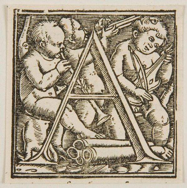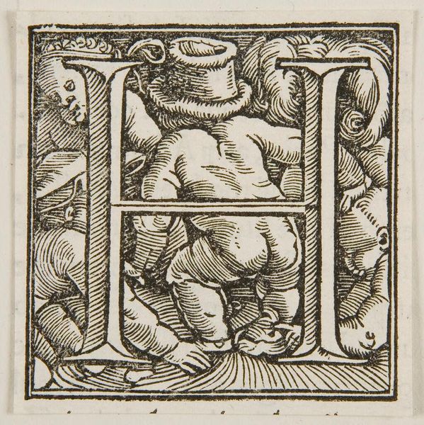 Curator: Look at this woodcut, simply titled "Initial M," made by an anonymous artist. It's positively teeming with life, isn't it? Editor: Absolutely, but it also whispers of power structures, the 'M' perhaps acting as a gateway to masculine-dominated narratives. Curator: Oh, I love that! For me, the cherubic figure intertwined with the letter feels playful, almost mischievous. The detail, with all those leaves and creatures, is just incredible. Editor: The prominence of idealized, almost eroticized bodies does need unpacking, though. Consider the historical context—who was this imagery intended for? Curator: Perhaps someone with a sense of humor? It's a delightful, strange little world, isn't it? A reminder that art can be both beautiful and...complicated. Editor: Precisely, and it's in those complications that we find richer layers of meaning, and, hopefully, a better understanding of ourselves.