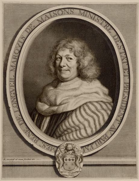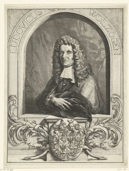 Curator: So, here we have "Portret van Cornelis Pronk, in ovale lauwerkrans," which translates to Portrait of Cornelis Pronk in an Oval Laurel Wreath. It's attributed to P. Schaak and likely dates to somewhere between 1700 and 1800. It's a pencil drawing. Editor: You know, the first thing that hits me is how incredibly delicate the line work is. It feels like looking at a whisper, something barely there but intensely present at the same time. The way the artist captured light and shadow with such simple means is really kind of stunning. Curator: That sense of delicate impermanence is quite fitting. Laurel wreaths themselves have such layered significance – victory, honour, but also transience. They're essentially leaves destined to wither. Enclosing Pronk within this wreath adds another layer. Editor: Absolutely! It frames him, not just visually but conceptually. Like he’s earned his place, a sort of fleeting immortality captured in pencil on paper. There's something really beautiful, almost bittersweet about that. And that almost unsettling gaze! I'm compelled. Is that arrogance or anxiety I wonder? Curator: Well, considering the historical weight associated with portraiture during that era, it does add an interesting lens. Portraiture served as a status marker, almost a type of social currency and, the baroque portrait aimed to make a big impression. I’d venture his penetrating gaze says “notice me, admire me!” Editor: Oh, I agree, there's a bravado, sure, but I see doubt flickering in his eyes. The loose sketching of the clothing gives a rushed or undone feeling – is it perhaps commentary about being permanently posed for posterity? It reminds me, on the other hand, of a charcoal sketch Caravaggio would work. Curator: Possibly a sketch of an oil, but it's clearly meant for show, no quick and private studies! That very deliberate use of line suggests Schaak knew exactly how he wanted Pronk to be remembered. Editor: Or perhaps the goal of how Pronk wished to be remembered? There is the possibility of some ego-stroking going on in the commission... Regardless, it’s a wonderful example of a specific moment in time immortalised through a portrait. Curator: I agree; it encapsulates so much. The layering of laurel wreath symbolism combined with baroque portraiture creates a rich tableau open to diverse interpretation. Editor: Yeah, seeing something that feels simultaneously fragile and enduring... well, it sticks with you. Makes you think.
