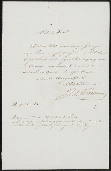 Curator: Here, hanging on the wall, is "Brief aan Johannes Jacobus Franciscus Wap," possibly from 1839, created by Louis Royer. It's housed here at the Rijksmuseum. You can see it's a pen and ink drawing on paper. What's your initial reaction? Editor: I feel like I’ve stumbled upon a secret! It looks like a private communication, something intimate and perhaps urgent. The script dances across the page. It feels almost theatrical, don’t you think? Curator: Indeed! The calligraphic style adds a layer of formality and artistry. Notice how Royer varies the weight of the lines and the spacing to create visual rhythm and hierarchy. The flourish in the signature, especially, feels incredibly deliberate. Editor: It’s almost like the writing *is* the drawing. The letterforms become shapes. I wonder, can you even read what it says? The curves are lovely, but they obscure the message a bit. Curator: You raise a salient point. Legibility takes a back seat to aesthetics here. This blurring of the lines – where writing becomes image and vice-versa – highlights the material quality of the artwork, it exists primarily for display, rather than reading. The viewer is forced to confront the surface, the ink on the paper. Editor: But there’s still a sense of someone communicating with someone. It brings to mind the idea of artistic correspondence and intellectual exchange. Like dropping in on someone else’s conversation or innermost thoughts! Curator: Yes, exactly. Although primarily concerned with the interplay of form and material, there is a narrative aspect as well. It gestures toward relationships. It presents the structure of connection as both conceptual and visual. Editor: For me, the personal connection is the heart of the piece, it’s like peeking into the artist's journal or personal letters and wondering about their passions. The little mystery pulls me in. Curator: A testament to art's power to provoke and connect, across time and mediums! The materiality, however, is primary. Editor: True. In a way, it reminds me to treasure handwritten things, to not let our devices completely erase the beauty of penmanship, the artistry in correspondence. It's something real, tangible… Curator: Indeed, something very tangible. Thank you.
