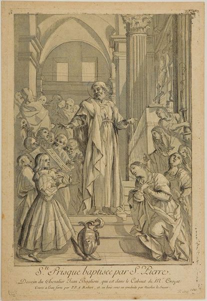Editor: This is Andrea Scacciati’s "Presentation in the Temple," created around the mid-18th century. It's a print, and its circular composition gives it a sense of timelessness. What stands out to you about its symbolic weight? Curator: The presentation itself is laden with cultural meaning, but note how the figures are rendered. They aren't simply bodies, but vessels of inherited belief. The artist captures how faith imprints itself upon those who hold it. How do you interpret the somber tone? Editor: It feels like a moment of solemn exchange, a passing of legacy. I hadn't considered how the figures’ postures reinforce that. Curator: Exactly. Scacciati shows us not just the event, but how generations carry forward sacred traditions and ideals, visualized here through gestures and garments. Editor: I’ll look at religious art differently now, considering its symbolic inheritance. Thanks! Curator: A pleasure to unveil the layers with you.