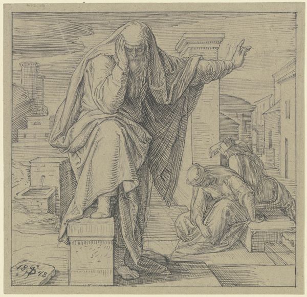 Curator: This pen and ink drawing, executed in 1797 by Nicolai Abildgaard, is titled "Richelieu before Rhadamanthus." The scene depicts the Cardinal confessing his sins. What’s your immediate take on it? Editor: Well, there's a dramatic stillness about it. The sepia tones give it a sense of history, but also a somewhat macabre feel. Rhadamanthus's commanding posture juxtaposed with Richelieu's supplication—it speaks of judgment and consequence. Curator: It's certainly loaded. Abildgaard was working in a politically charged climate. Consider Richelieu: in French collective memory, he stands as a complicated symbol of state power, often seen as a ruthless operator, but also a figure responsible for consolidating the nation. Abildgaard seems to be placing him on trial here, both legally and morally. Editor: Yes, I notice that the artist gives more emotional weight to the figure of Rhadamanthus. His bare torso is so powerful. And I’m struck by the compositional choices. Rhadamanthus is placed higher, literally looking down at Richelieu, the Cardinal is covered, hiding everything. We cannot grasp who he is behind that rich robe. Curator: Exactly! That dichotomy speaks volumes about visibility and accountability. Abildgaard deliberately places Richelieu in the crosshairs. The piece reflects Enlightenment ideas questioning authority and demanding transparency. Editor: So it becomes more than just a historical portrait, but also a condemnation of abuse of power and the consequences of one’s actions, relevant even today. You could even consider Richelieu’s elaborate garments as representative of the structures that enable systemic injustice, making his confession a futile gesture, considering that Rhadamanthus seems unaffected. Curator: I find myself thinking about the function of such a drawing within Abildgaard’s own cultural context. To publicly scrutinize a figure like Richelieu implies a critique of contemporary power structures, challenging viewers to think critically about who benefits from those systems. Editor: Ultimately, for me, the power of this piece lies in its visual simplicity which hides complex narratives about legacy, judgment, and the enduring impact of power. Curator: I concur. It is a potent commentary, cleverly masked within classical motifs and historical figures.